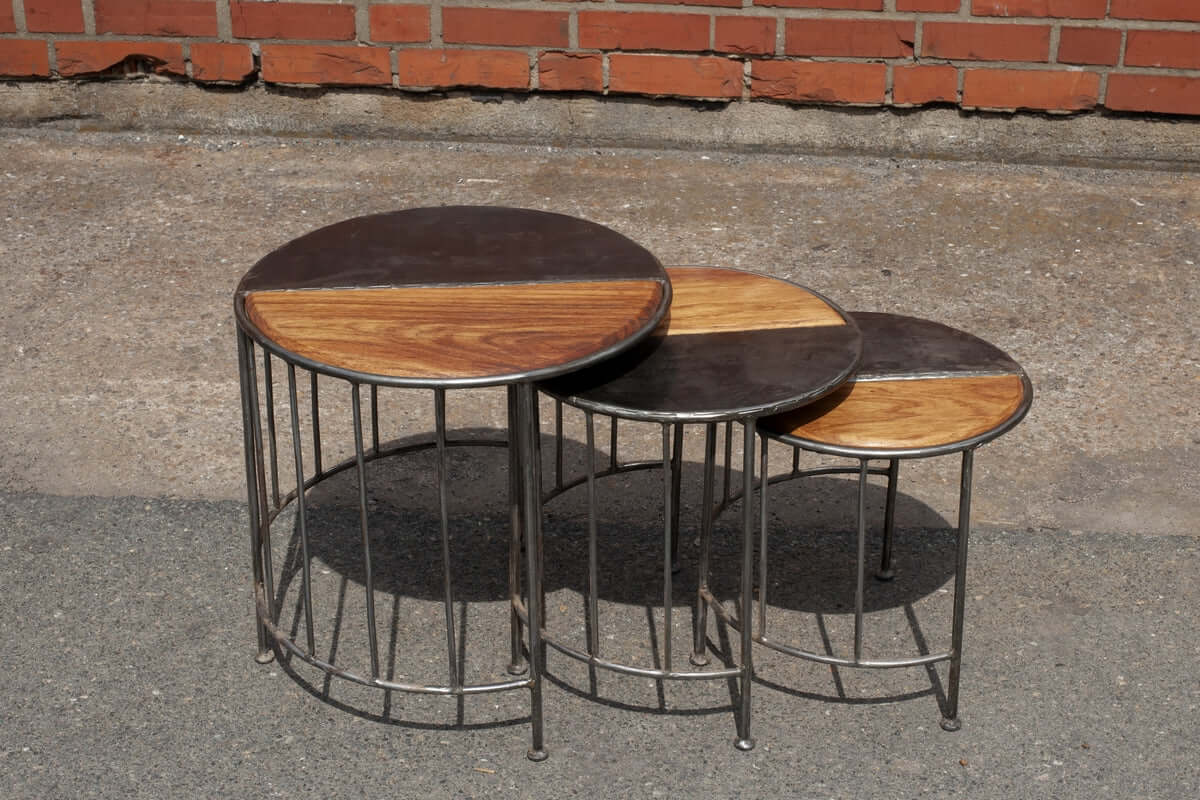 3er Set Beistelltische “Hassan” aus Altmetall und Altholz Upcycling