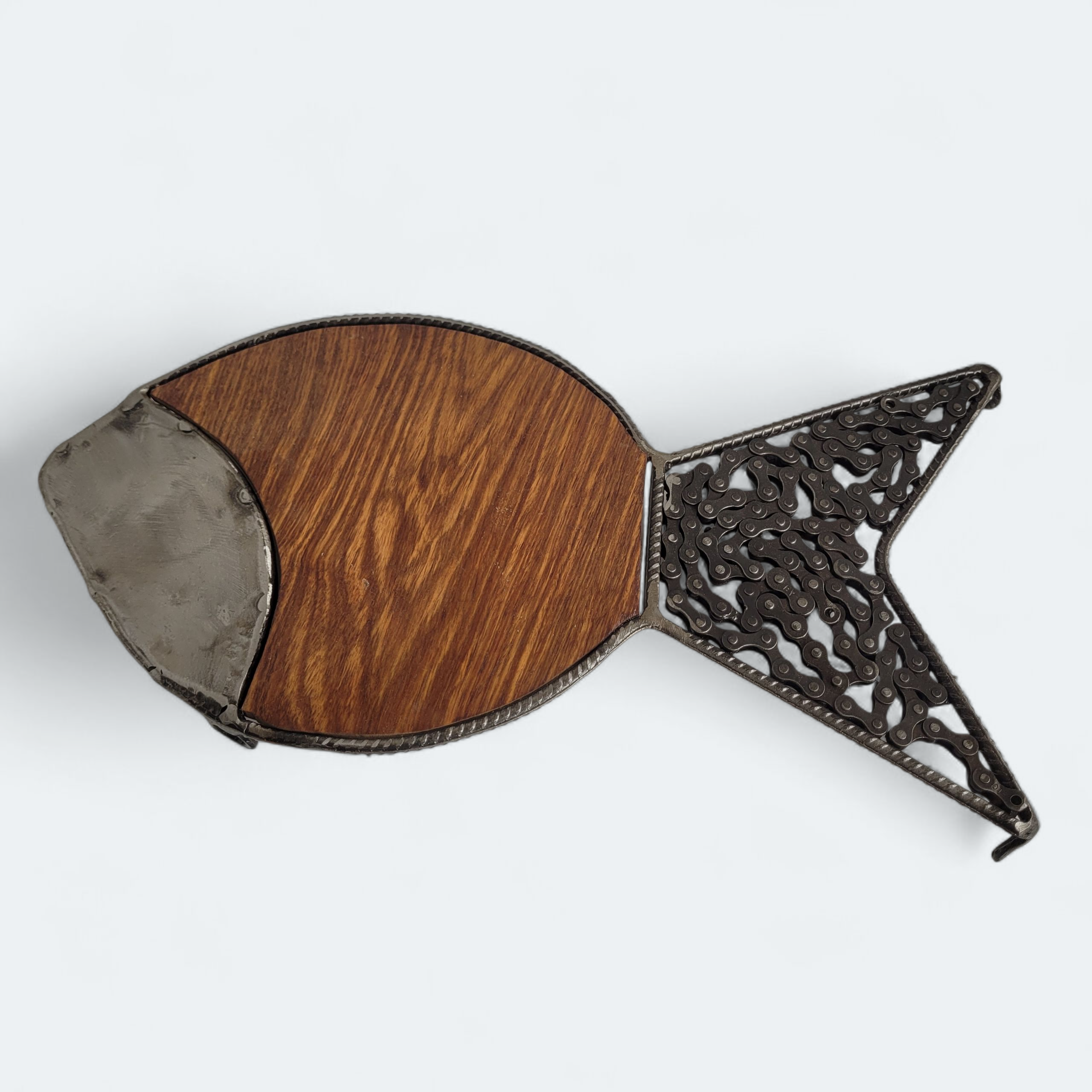 Untersetzer “Fisch” aus recycelten Ölfässern, Fahrradkette und Altholz Upcycling