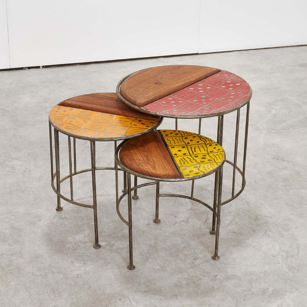 Dieser 3er Set wurde vom burkinischen Designer Hassan Dao entworfen und wird nun von seinem ehemaligen Lehrling und heute selbständigen Designer Olivier hergestellt. Maße der Tische: Große: Durchmesser 45 cm | Höhe: 45 cm Mittlere: Durchmesser 37 cm | Höhe: 41 cm Kleine: Durchmesser 34cm | Höhe: 35 cm Rohstoffe: Altmetall (recycelt) und Altholz (Fraké). Handgefertigt und fair gehandelt in Burkina Faso.