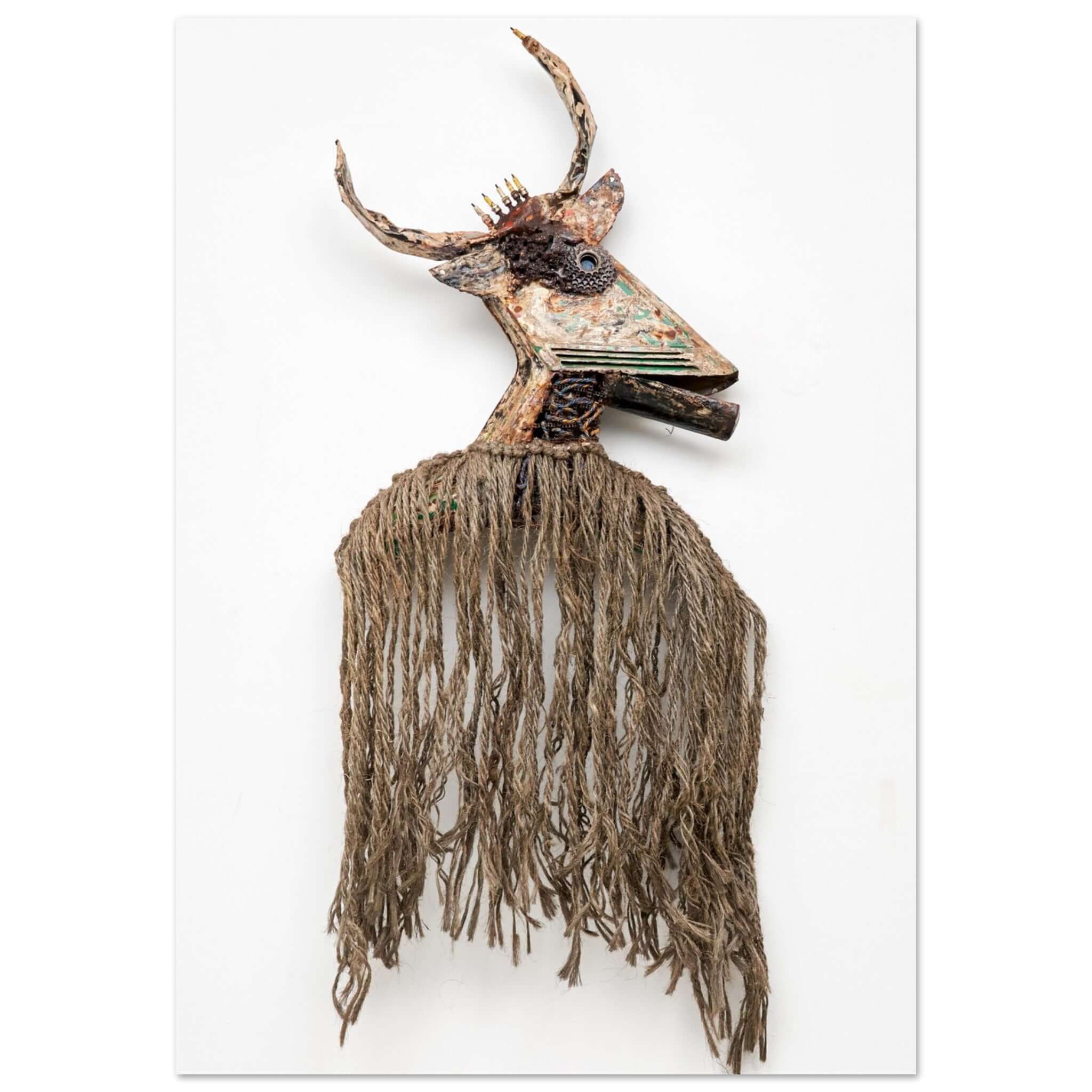 Ankata, Sahab Koanda – 2020 Der junge Sahab Koanda besuchte bis zu seinem zwölften Lebensjahr die Koranschule. Danach trat er ins Berufsleben ein, zunächst als Hilfsarbeiter auf Baustellen, dann als Lehrling als Fahrer in der Fadoul-Gruppe mit der Unterstützung seines älteren Bruders, der dort bereits angestellt war. Nach fünf Jahren gab er diese Aufgabe auf und ließ sich bei der Firma Oumarou Kanazoé (OK) anstellen. Nach drei Monaten Tätigkeit brach er den Vertrag aus persönlichen Gründen. Daraufhin kam ihm die Idee eines freien Berufs in den Sinn: der eines Künstlers, der es ihm ermöglicht, unabhängig zu agieren.Er ließ sich als Schauspieler in einer Jugendtheatergruppe im Stadtteil Tampouy (Ouagadougou) anstellen. Sein Talent als bildender Künstler beginnt sich zu entfalten. Er zeigt sich als künstlerisches Multitalent, lernt traditionellen und zeitgenössischen Tanz, spielt auf traditionellen Instrumenten wie dem “Djem bé” und lernt gleichzeitig, wie man sie herstellt. Seine ersten Werke als bildender Künstler beruhen auf hier und da gesammelten Stücken (alte Sohlen von Plastikklatschen, Kalebassenstücke, Jutesäcke, Besen, alte Näpfe usw.), die er in Form von dekorativen Bildern darstellte.Sahab Koanda, der vom Schauspieler zum Plastiker in der Altstoffsammlung wurde, hat so viele verschiedene künstlerische Richtungen eingeschlagen.Er ist Bildhauer, Maler, Musiker, Designer und arbeitet in Ausstellungen und Künstlerresidenzen in Burkina Faso und überall sonst auf der Welt, wobei er sich zeitweise auch als Geschichtenerzähler betätigt, der die reiche mündliche Tradition seines Landes fortführt. Wir bieten drei Formate an: – Unser schwereres, weißes, mattes Premium-Papier hat eine natürliche, glatte, ungestrichene Oberfläche, die sich luxuriös anfühlt. Das Papier mit einem Gewicht von 200 g/m2/ 80 lb ist haltbar und langlebig. – Unsere Master’s Edition, ein cremefarbenes Papier in Museumsqualität, ist ungestrichen und die beste Wahl für Kunstliebhaber, die erstklassige Qualität zu schätzen wissen, um Kunstwerke auf luxuriöse Weise zu genießen. Das 250 g/ 110lb-Papier eignet sich perfekt für Kunstwerke und ist so konzipiert, dass es jahrelang hält, ohne seine ursprüngliche Schönheit zu verlieren. Unser mattes Papier ist ungestrichen und naturweiß (off-white). – Unsere gerahmten Holzposter sind die perfekte Kombination aus Schlichtheit und Robustheit. Das Poster ist auf unserem Master’s Edition Papier in Museumsqualität gedruckt. Es ist cremefarben, ungestrichen und die beste Wahl für Kunstliebhaber, die erstklassige Qualität schätzen, um Kunstwerke auf luxuriöse Weise zu genießen. Wir verwenden FSC-zertifiziertes Papier oder gleichwertige Zertifizierungen, je nach regionaler Verfügbarkeit. Das ist besser für die Menschen und den Planeten. Jedes Poster wird in einer robusten Verpackung versandt, damit es sicher und geschützt ankommt.