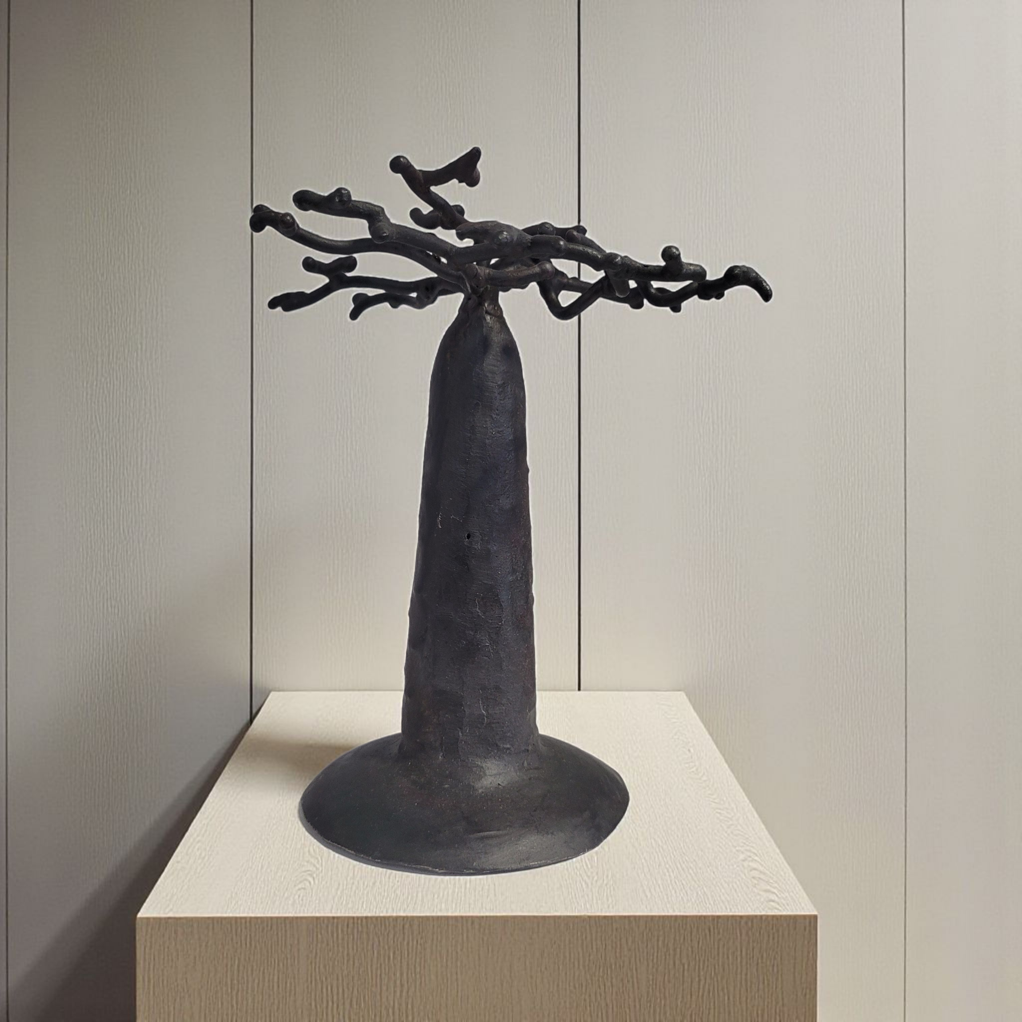 Moogoo präsentiert euch eine kleine Kollektion von handgemachten Baobab-Bäumen aus Madagaskar. Diese sind hohl und aus recycelten Ölfässern hergestellt. Dieser für viele afrikanische Länder charakteristische Baum ist zu einem Symbol Madagaskars geworden und ziert sogar die Münzen des Landes. Grund genug für einige lokale Designer:innen, diesen Baum durch die Kunst des Upcyclings zu verewigen. Als Deko-Objekt oder Schmuckhalter: Diese Unikate sind wahre Hingucker für euer Zuhause. Rohstoff: Altmetall (recycelte Ölfässer)Modell DONGAKELYDer “aufgeblasene” Stamm ist charakteristisch für dieses Baobab-Modell. 13 cm – Ø 9 cm | H 13 cm | 130 Gr | Schwarz lackiert17 cm – Ø 14 cm | H 17 cm | 300 Gr | Schwarz lackiert Modell FANANTENANADieses Modell besticht durch seine schlanke Form und einen filigranen Stamm. Besonders auffällig ist sein seitlicher Ast, der niedriger wächst als die anderen nach oben gerichteten Äste. 15 cm – Ø 10 cm | H 15 cm | 130 Gr | Schwarz lackiert20 cm – Ø 12 cm | H 20 cm | 160 Gr | Schwarz lackiert