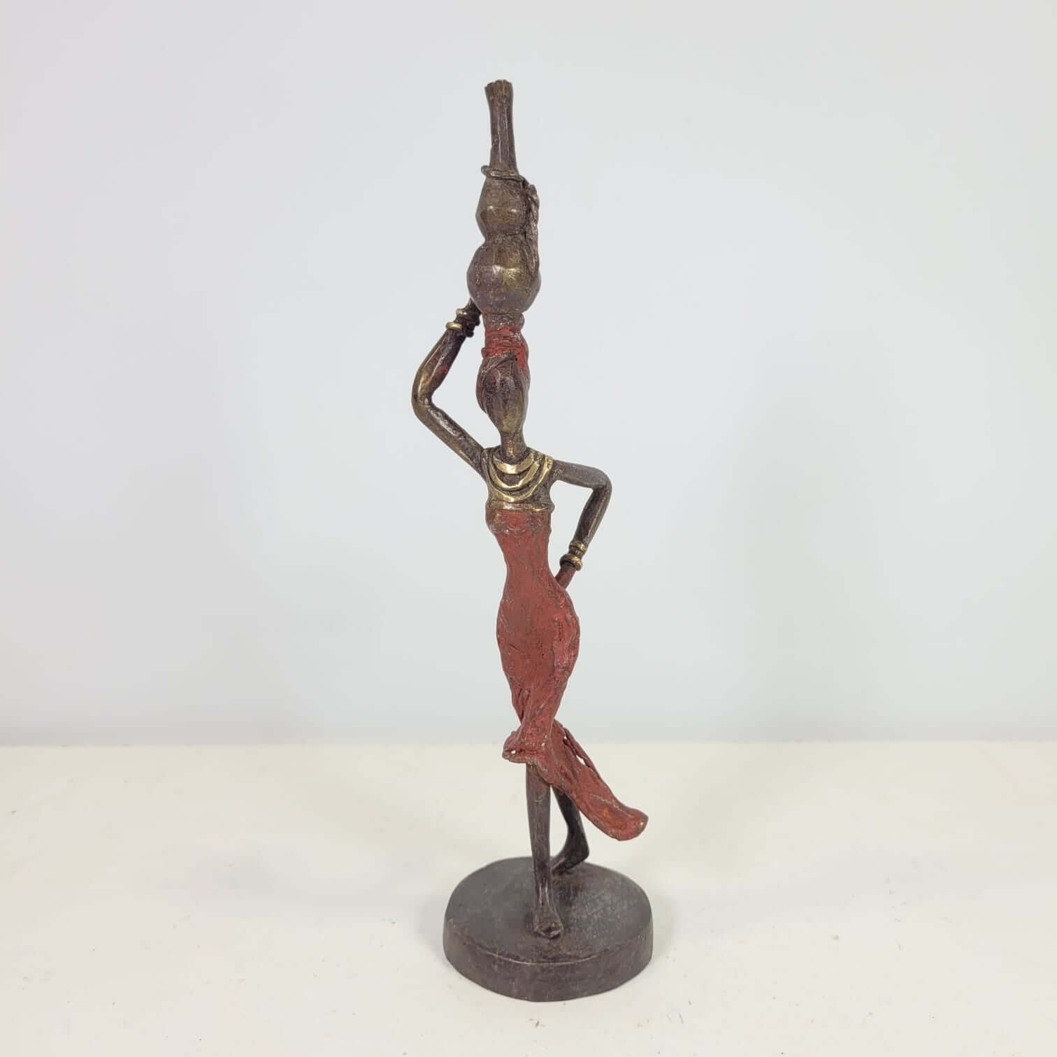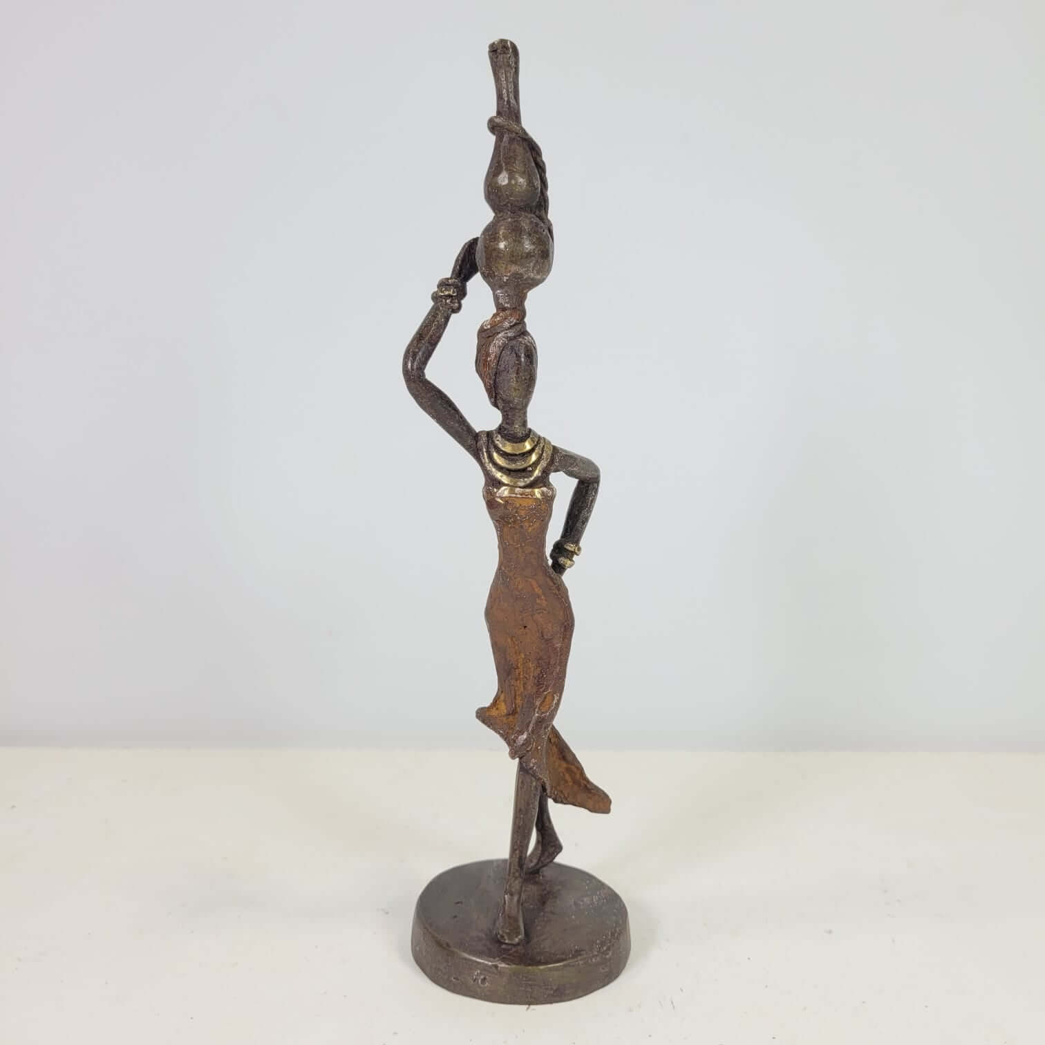 Diese eleganten Bronzeskulpturen wurde vom burkinischen Künstler Karim Sana geschaffen.Die Arbeit mit Bronze ist ein traditionelles Handwerk in Burkina Faso. Der Begriff Bronze bezieht sich auf verschiedene Legierungen auf der Basis von Kupfer, Zink, Blei und Zinn, deren Anteile variieren. Die Bronze stammt heute aus dem Recycling von alten Armaturen, wie Wasserhähnen oder Teilen aus Klimaanlagen.Der Künstler schafft zuerst eine Wachsskulptur, die mit einem Sandgemisch aus Lehm und Dung bedeckt und getrocknet wird. Die Form wird anschließend gekocht, das Wachs schmilzt und entweicht durch die Löcher. Die geschmolzene Legierung wird gegossen und nimmt den Platz des Wachses ein. Nach dem Abkühlen wird die Form gebrochen, um die Skulptur zu entnehmen und die letzten Feinschliffe vorzunehmen. Jedes Stück ist somit ein Unikat.Hergestellt und fair gehandelt in Burkina Faso, Afrika.Jedes Stück ist ein Unikat und kann leicht vom Bild abweichen. Höhe: ca. 20 cm / 28 cmGewicht: ca. 0,3 kg / 0,6 kgIn verschiedenen Farben je nach Verfügbarkeit erhältlich: türkis, braun, blau, grün, rot.