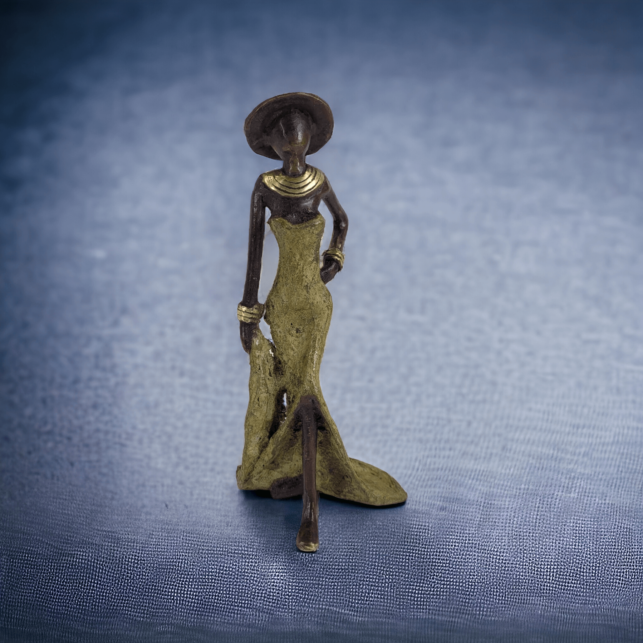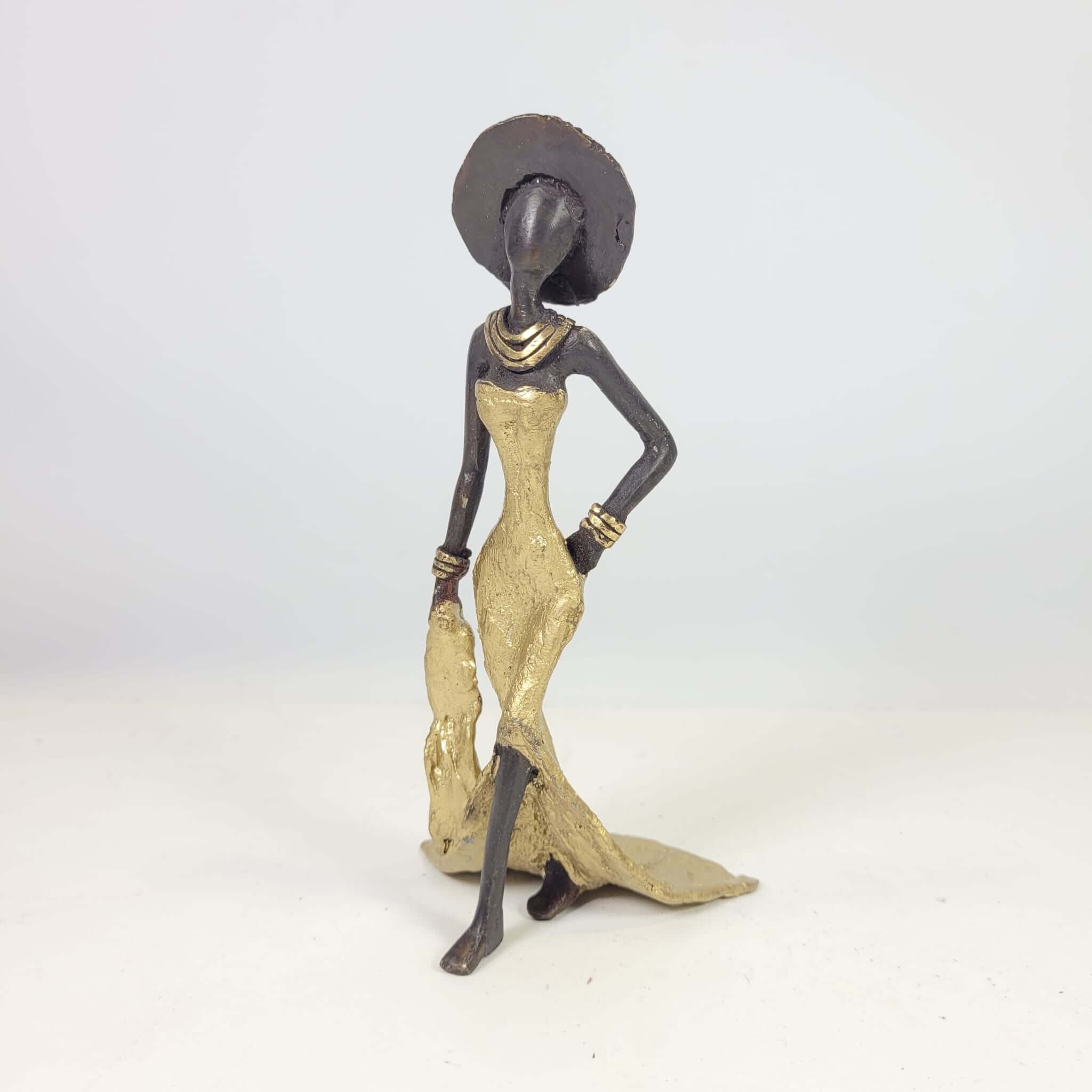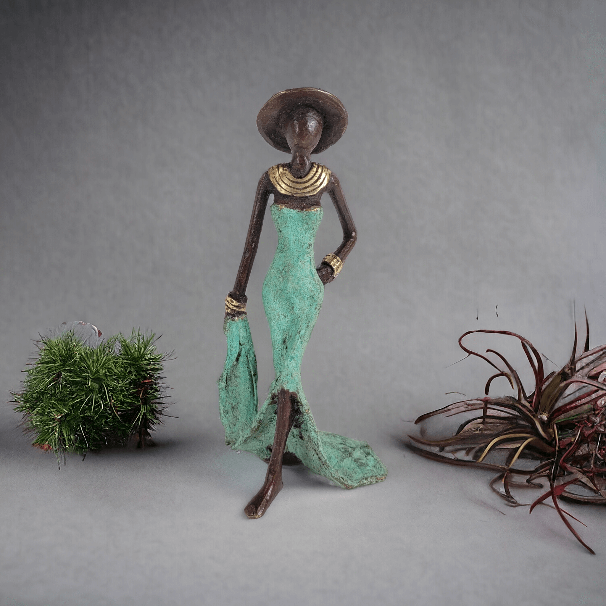 Diese eleganten Bronzeskulpturen wurde vom burkinischen Künstler Soré geschaffen.Die Arbeit mit Bronze ist ein traditionelles Handwerk in Burkina Faso. Der Begriff Bronze bezieht sich auf verschiedene Legierungen auf der Basis von Kupfer, Zink, Blei und Zinn, deren Anteile variieren. Die Bronze stammt heute aus dem Recycling von alten Armaturen, wie Wasserhähnen oder Teilen aus Klimaanlagen.Der Künstler schafft zuerst eine Wachsskulptur, die mit einem Sandgemisch aus Lehm und Dung bedeckt und getrocknet wird. Die Form wird anschließend gekocht, das Wachs schmilzt und entweicht durch die Löcher. Die geschmolzene Legierung wird gegossen und nimmt den Platz des Wachses ein. Nach dem Abkühlen wird die Form gebrochen, um die Skulptur zu entnehmen und die letzten Feinschliffe vorzunehmen. Jedes Stück ist somit ein Unikat.Hergestellt und fair gehandelt in Burkina Faso, Afrika.Jedes Stück ist ein Unikat und kann leicht vom Bild abweichen. Höhe: ca. 16 cmGewicht: ca. 0,3 kgIn verschiedenen Farben je nach Verfügbarkeit erhältlich: türkis, braun, blau, grün, rot.