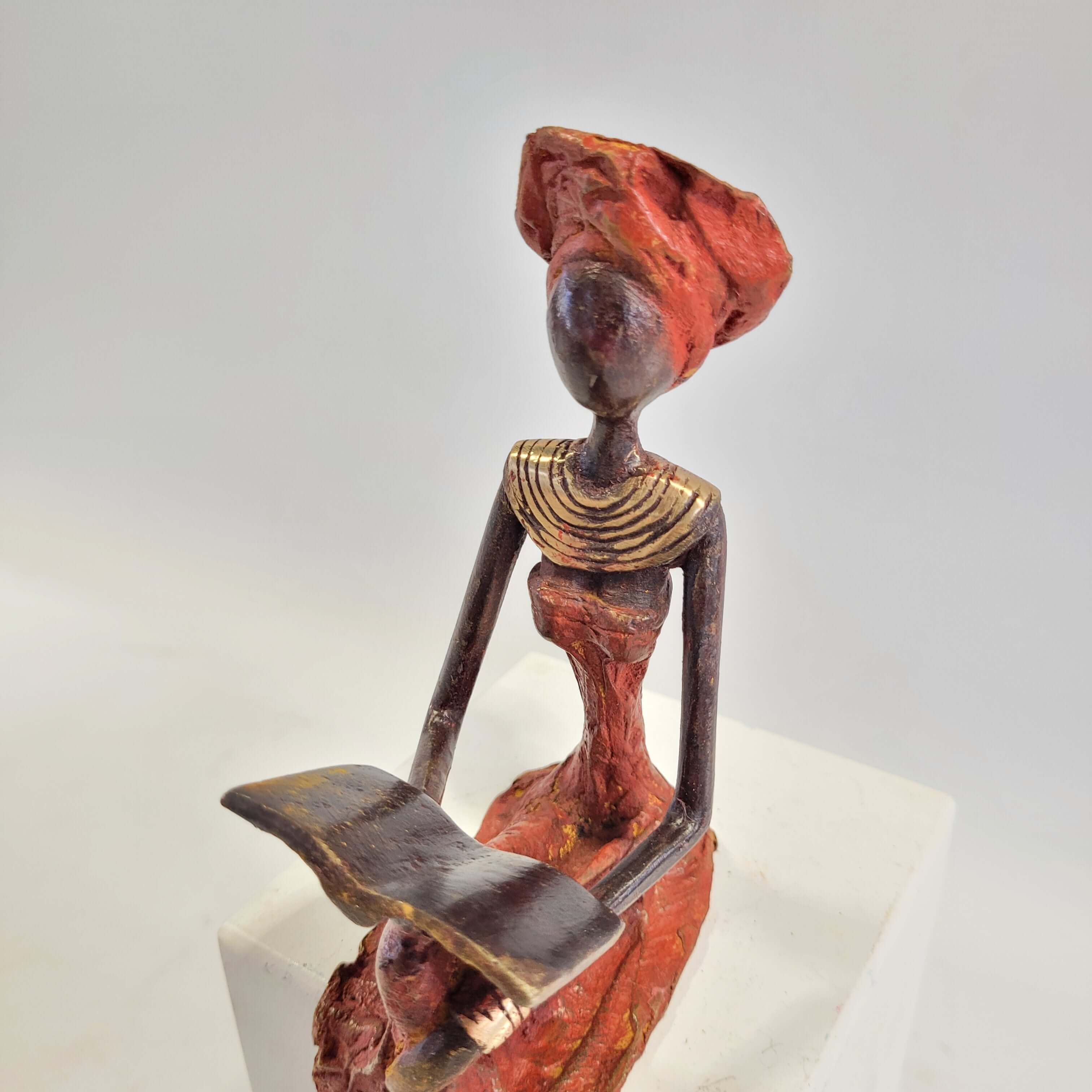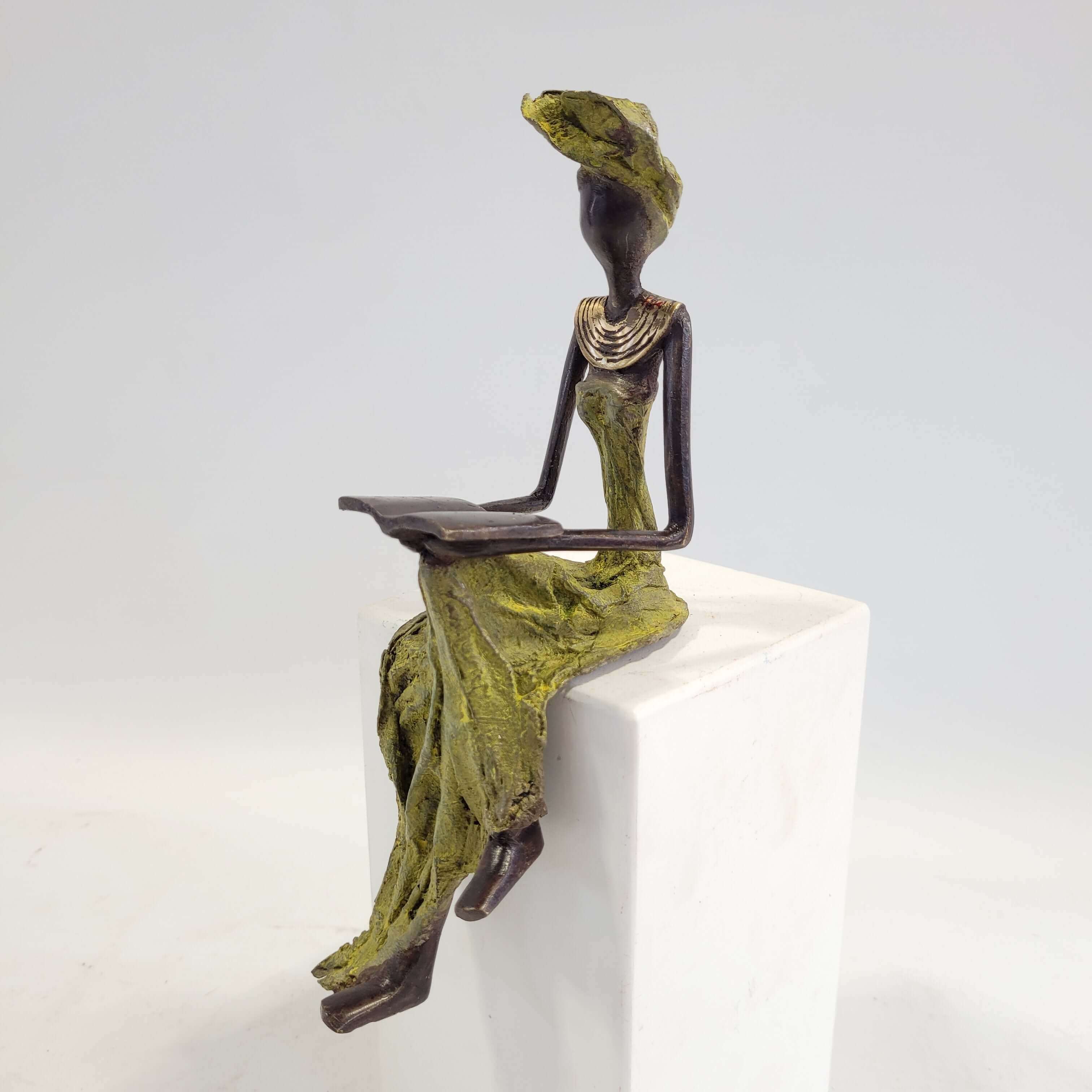 Diese elegante Bronzeskulptur wurde vom burkinischen Künstler Hamed Nikiema geschaffen. Die lesende Frau ist ein Symbol für gelehrte und starke Frauen in Afrika.Die Arbeit mit Bronze ist ein traditionelles Handwerk in Burkina Faso. Der Begriff Bronze bezieht sich auf verschiedene Legierungen auf der Basis von Kupfer, Zink, Blei und Zinn, deren Anteile variieren. Die Bronze stammt heute aus dem Recycling von alten Armaturen, wie Wasserhähnen oder Teilen aus Klimaanlagen.Der Künstler schafft zuerst eine Wachsskulptur, die mit einem Sandgemisch aus Lehm und Dung bedeckt und getrocknet wird. Die Form wird anschließend gekocht, das Wachs schmilzt und entweicht durch die Löcher. Die geschmolzene Legierung wird gegossen und nimmt den Platz des Wachses ein. Nach dem Abkühlen wird die Form gebrochen, um die Skulptur zu entnehmen und die letzten Feinschliffe vorzunehmen. Jedes Stück ist somit ein Unikat. Höhe: 23 cmGewicht: ca. 500 g Hergestellt und fair gehandelt in Burkina Faso.