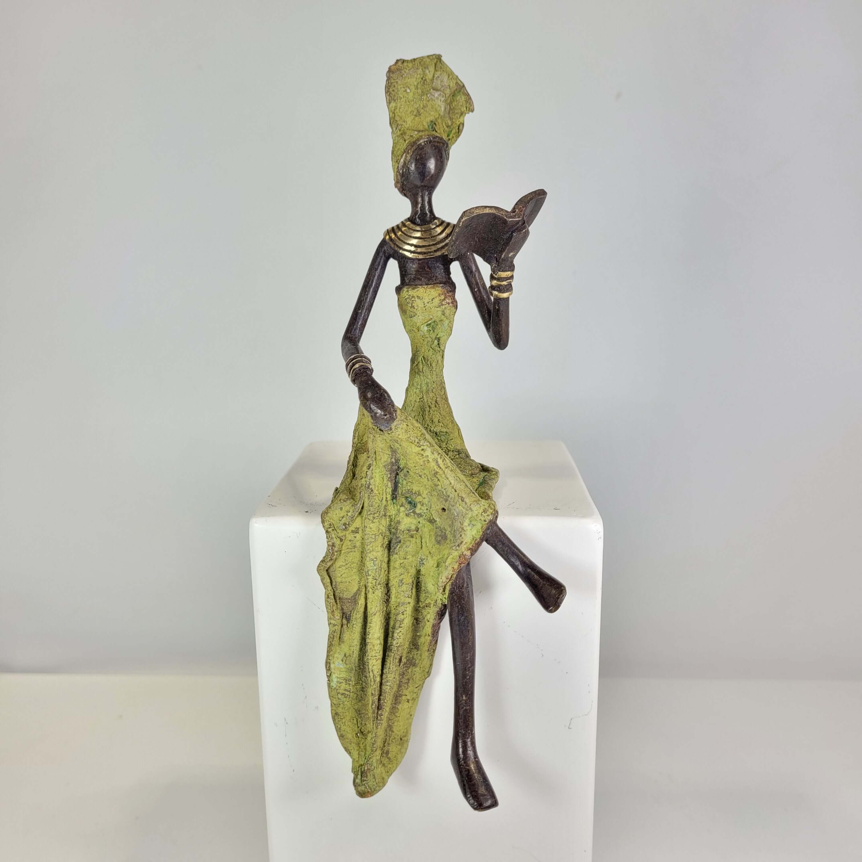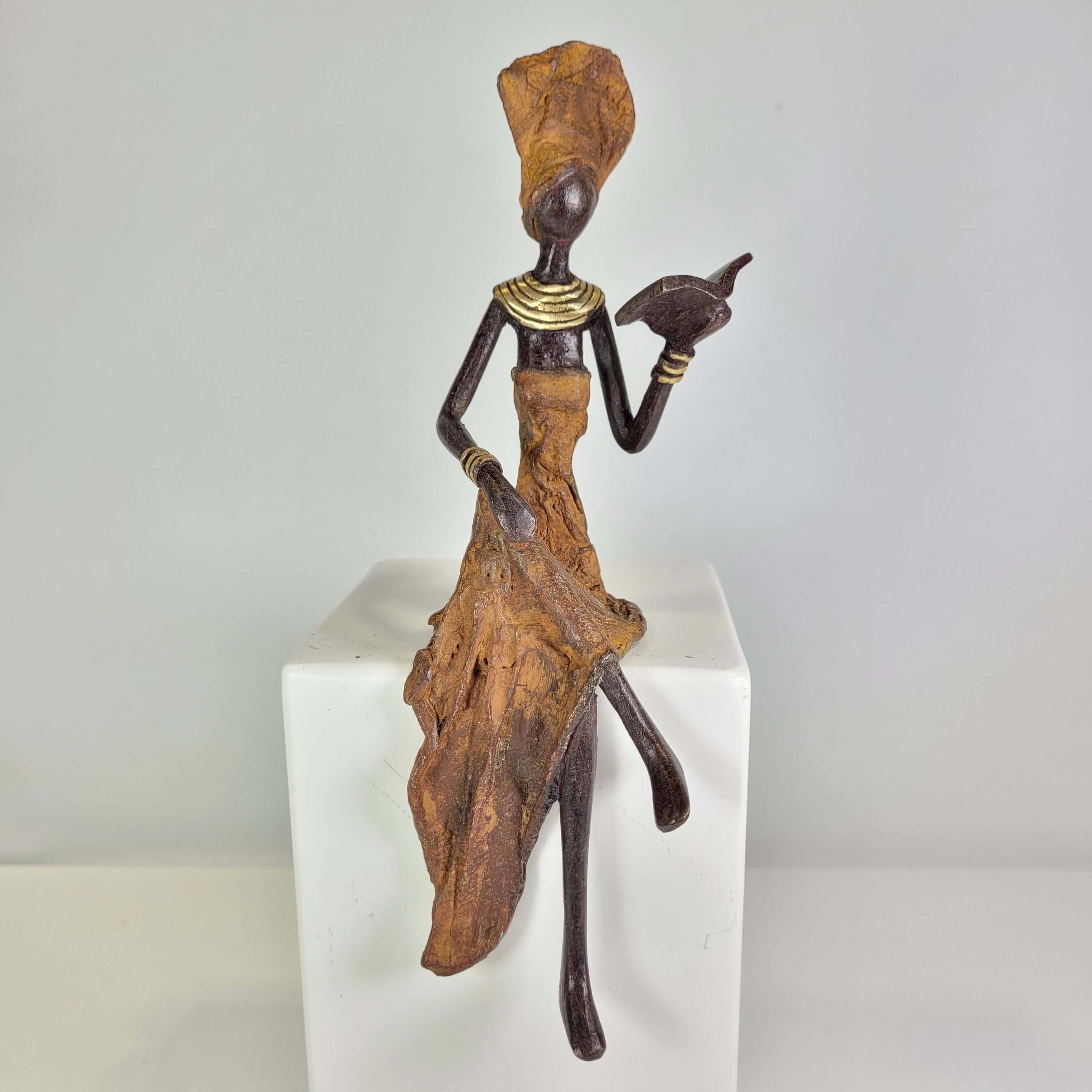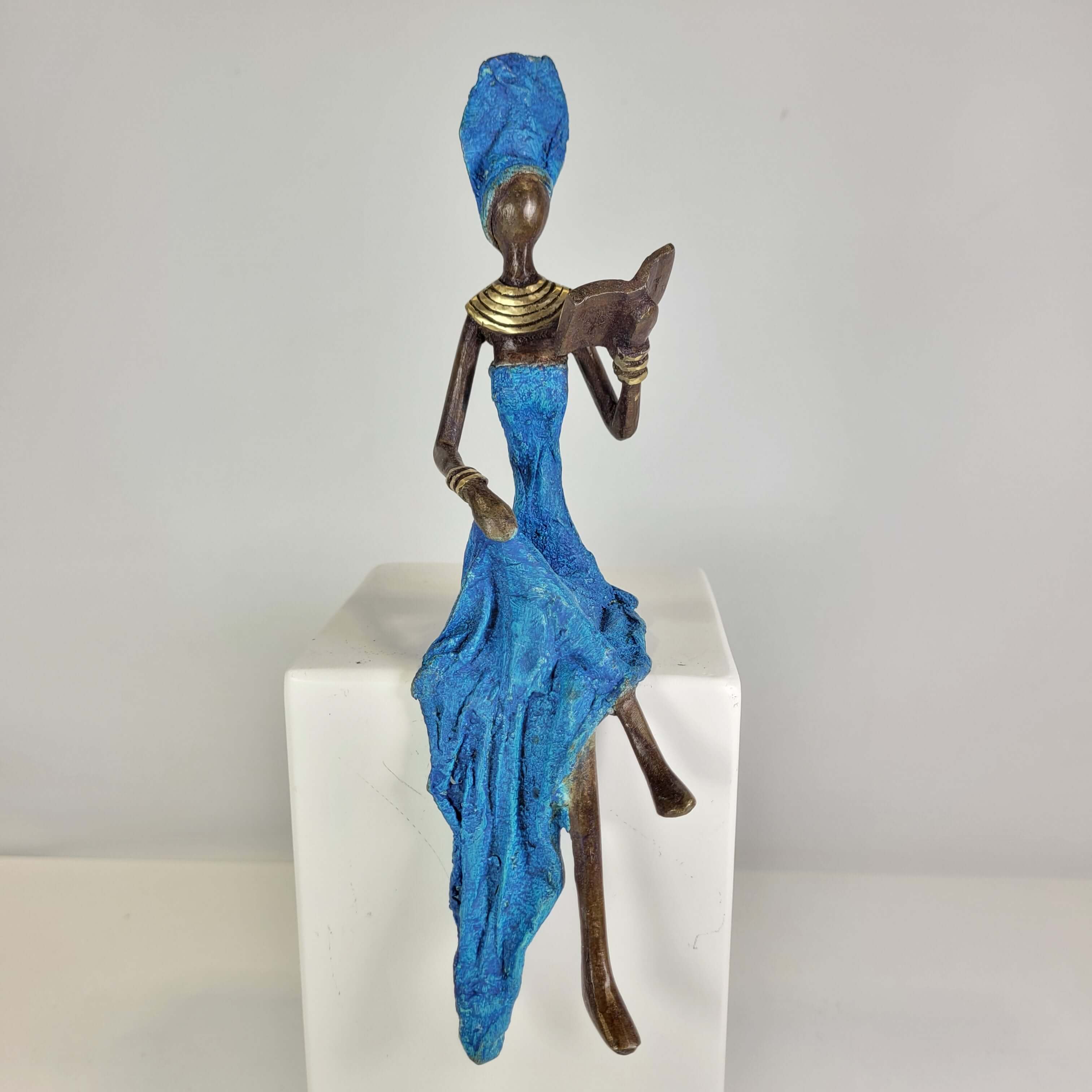Diese eleganten Bronzeskulpturen wurden vom burkinischen Künstler Karim Sana geschaffen.Die Arbeit mit Bronze ist ein traditionelles Handwerk in Burkina Faso. Der Begriff Bronze bezieht sich auf verschiedene Legierungen auf der Basis von Kupfer, Zink, Blei und Zinn, deren Anteile variieren. Die Bronze stammt heute aus dem Recycling von alten Armaturen, wie Wasserhähnen oder Teilen aus Klimaanlagen.Der Künstler schafft zuerst eine Wachsskulptur, die mit einem Sandgemisch aus Lehm und Dung bedeckt und getrocknet wird. Die Form wird anschließend gekocht, das Wachs schmilzt und entweicht durch die Löcher. Die geschmolzene Legierung wird gegossen und nimmt den Platz des Wachses ein. Nach dem Abkühlen wird die Form gebrochen, um die Skulptur zu entnehmen und die letzten Feinschliffe vorzunehmen. Jedes Stück ist somit ein Unikat.Hergestellt und fair gehandelt in Burkina Faso, Afrika.Jedes Stück ist ein Unikat und kann leicht vom Bild abweichen. Höhe: ca. 15 cm / 22 cmGewicht: ca. 0,25 kg / 0,5 kgIn verschiedenen Farben je nach Verfügbarkeit erhältlich: türkis, braun, blau, grün, rot, schwarz & gold (mit Bronze ohne Patina, deshalb “gold”), gold.
