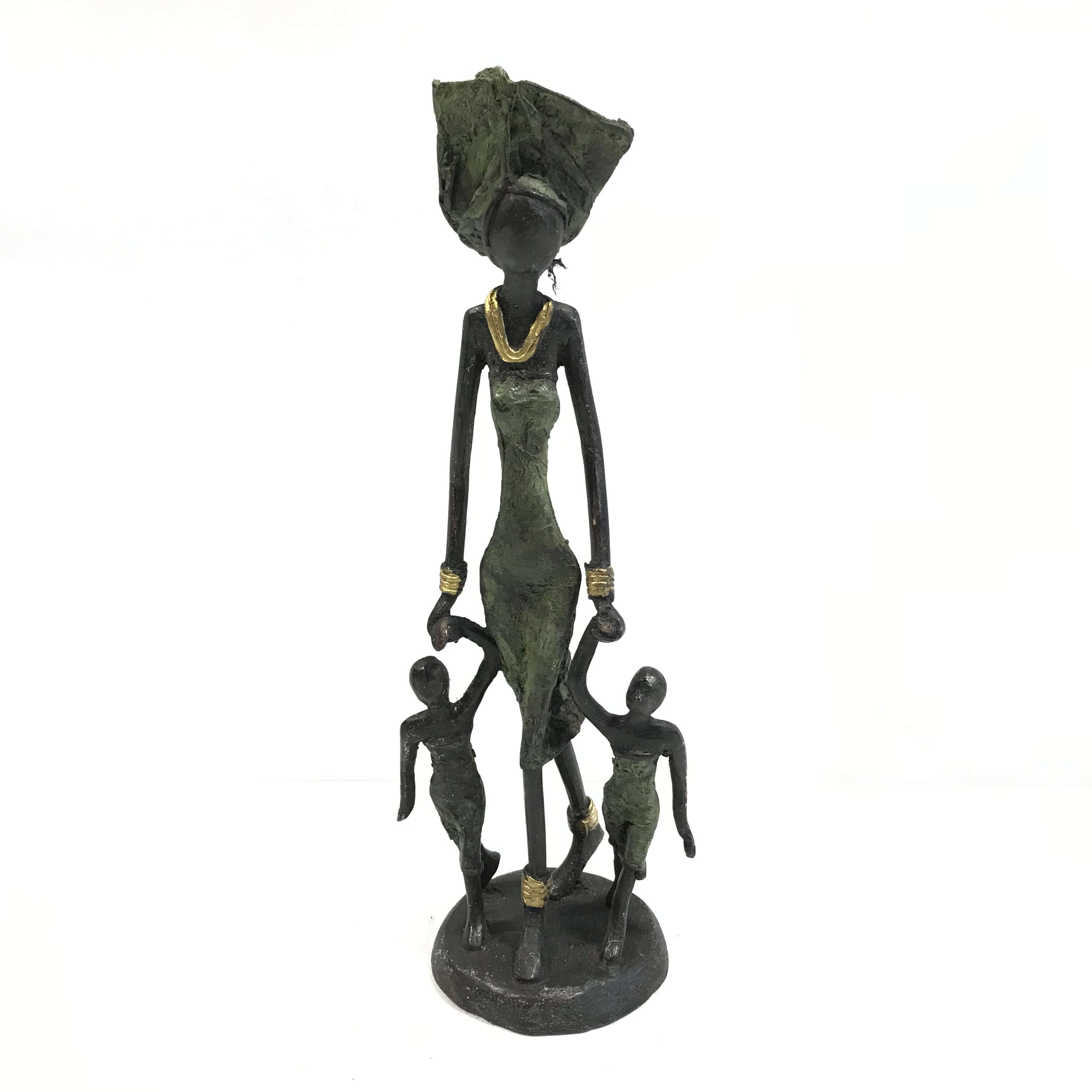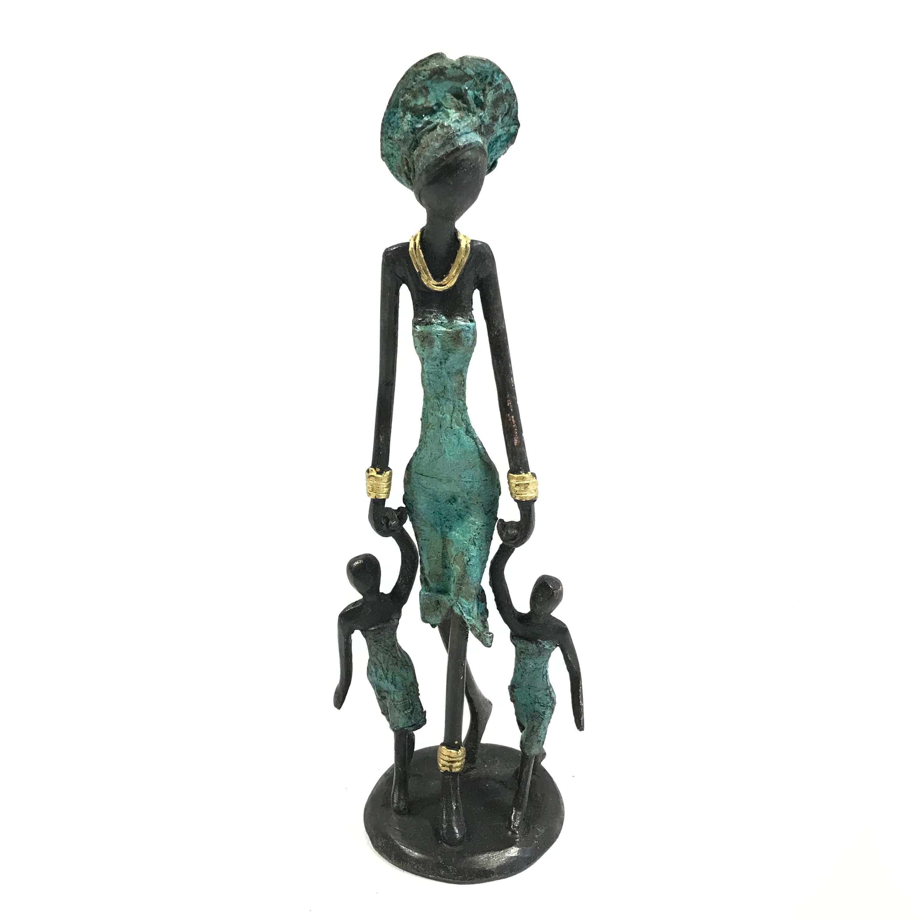 Diese eleganten Bronzeskulpturen wurden vom burkinischen Künstler Issouf geschaffen. Wir präsentieren hier ein einziges Motiv, das in verschiedenen Farben verfügbar ist.Die Arbeit mit Bronze ist ein traditionelles Handwerk in Burkina Faso. Der Begriff Bronze bezieht sich auf verschiedene Legierungen auf der Basis von Kupfer, Zink, Blei und Zinn, deren Anteile variieren. Die Bronze stammt heute aus dem Recycling von alten Armaturen, wie Wasserhähnen oder Teilen aus Klimaanlagen.Der Künstler schafft zuerst eine Wachsskulptur, die mit einem Sandgemisch aus Lehm und Dung bedeckt und getrocknet wird. Die Form wird anschließend gekocht, das Wachs schmilzt und entweicht durch die Löcher. Die geschmolzene Legierung wird gegossen und nimmt den Platz des Wachses ein. Nach dem Abkühlen wird die Form gebrochen, um die Skulptur zu entnehmen und die letzten Feinschliffe vorzunehmen. Jedes Stück ist somit ein Unikat. Höhe: ca. 35-38 cm | Gewicht: ca. 1,2 kg Verschiedene Farben je nach Verfügbarkeit erhältlich: grün, türkis, blau, rot, braun.Hergestellt und fair gehandelt in Burkina Faso.