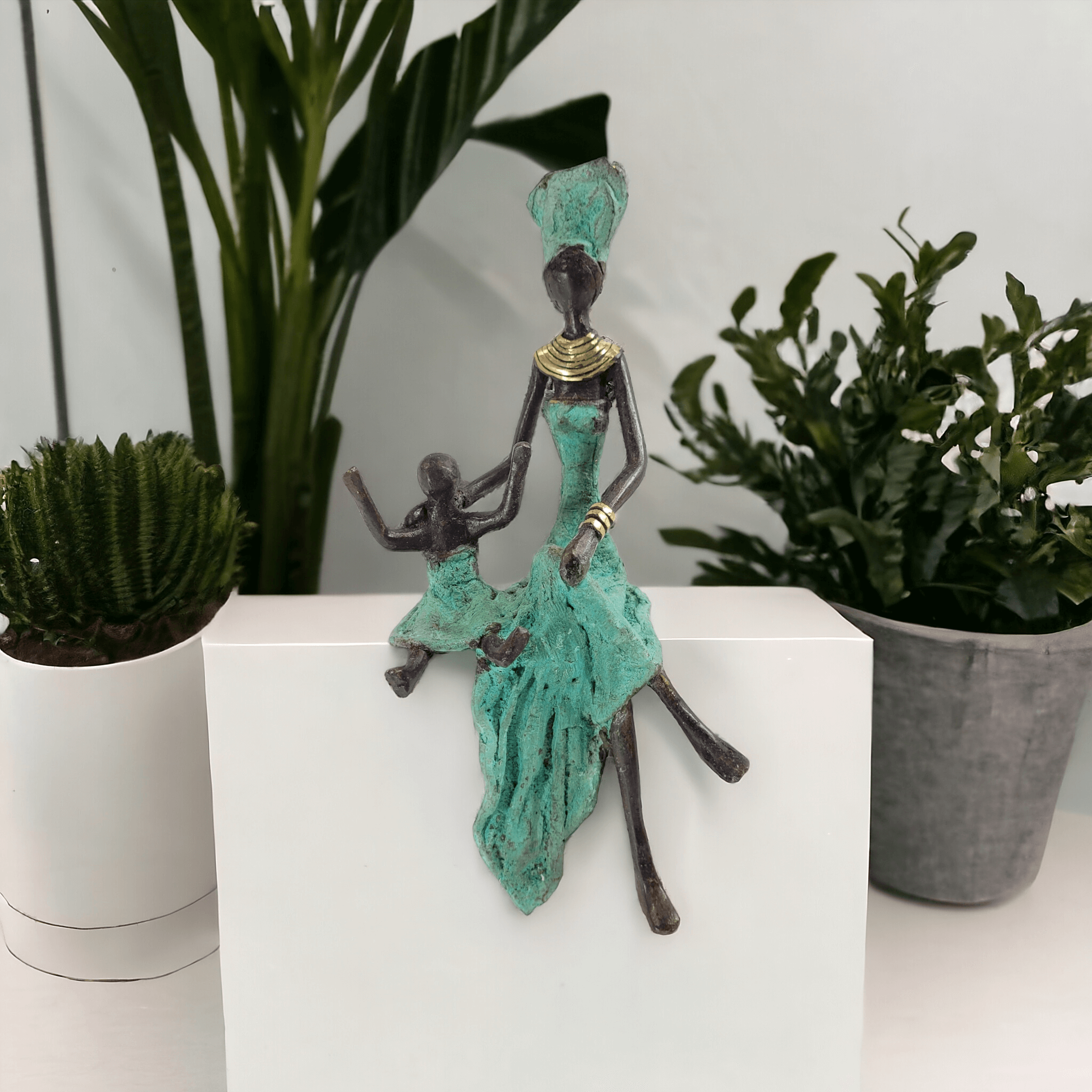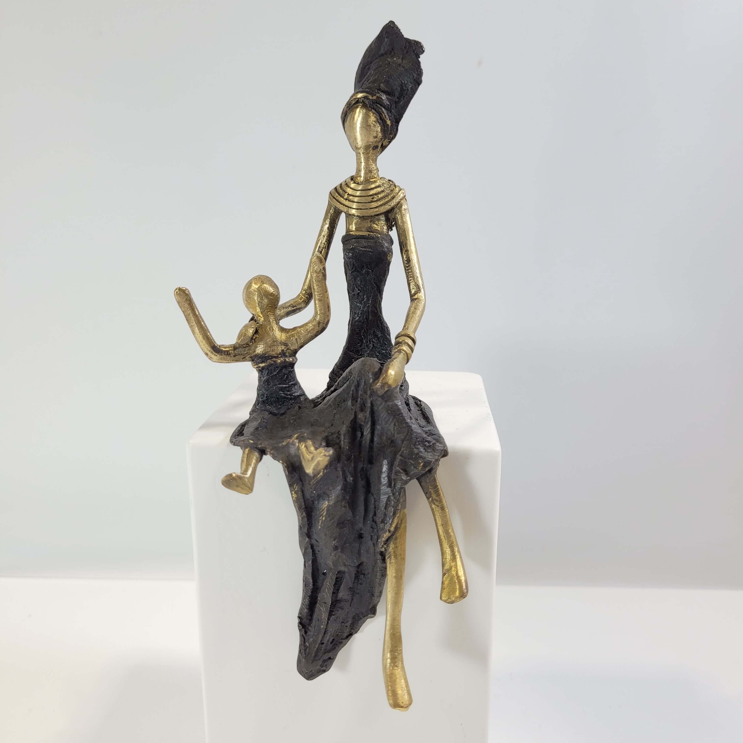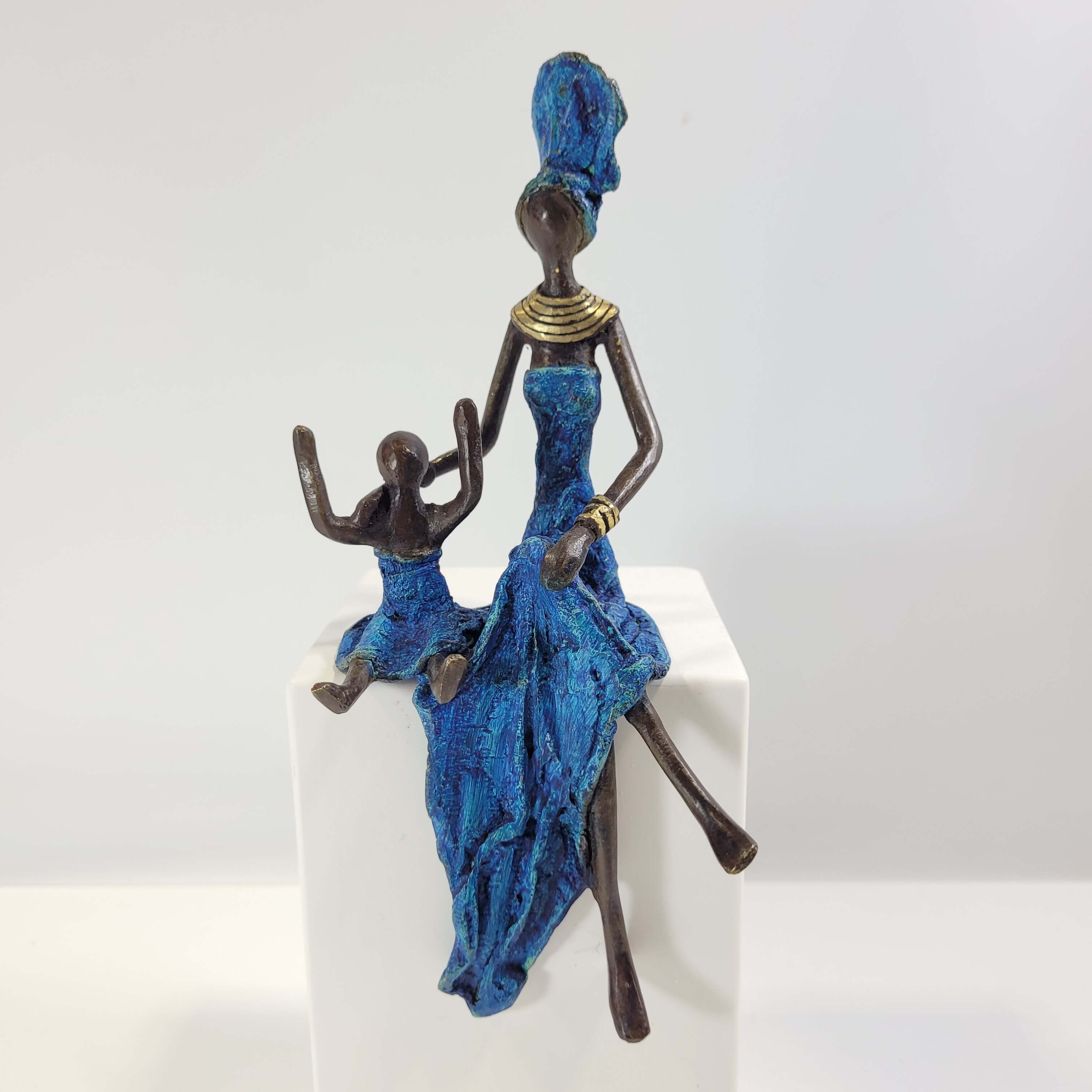 Diese eleganten Bronzeskulpturen wurden vom burkinischen Künstler Karim geschaffen.Die Arbeit mit Bronze ist ein traditionelles Handwerk in Burkina Faso. Der Begriff Bronze bezieht sich auf verschiedene Legierungen auf der Basis von Kupfer, Zink, Blei und Zinn, deren Anteile variieren. Die Bronze stammt heute aus dem Recycling von alten Armaturen, wie Wasserhähnen oder Teilen aus Klimaanlagen.Der Künstler schafft zuerst eine Wachsskulptur, die mit einem Sandgemisch aus Lehm und Dung bedeckt und getrocknet wird. Die Form wird anschließend gekocht, das Wachs schmilzt und entweicht durch die Löcher. Die geschmolzene Legierung wird gegossen und nimmt den Platz des Wachses ein. Nach dem Abkühlen wird die Form gebrochen, um die Skulptur zu entnehmen und die letzten Feinschliffe vorzunehmen. Jedes Stück ist somit ein Unikat.Hergestellt und fair gehandelt in Burkina Faso, Afrika.Jedes Stück ist ein Unikat und kann leicht vom Bild abweichen. Höhe: ca. 15 cm / 20 cmGewicht: ca. 0,25 kg / 0,5 kgIn verschiedenen Farben je nach Verfügbarkeit erhältlich: türkis, braun, blau, grün, rot, schwarz & gold (mit Bronze ohne Patina, deshalb “gold”).