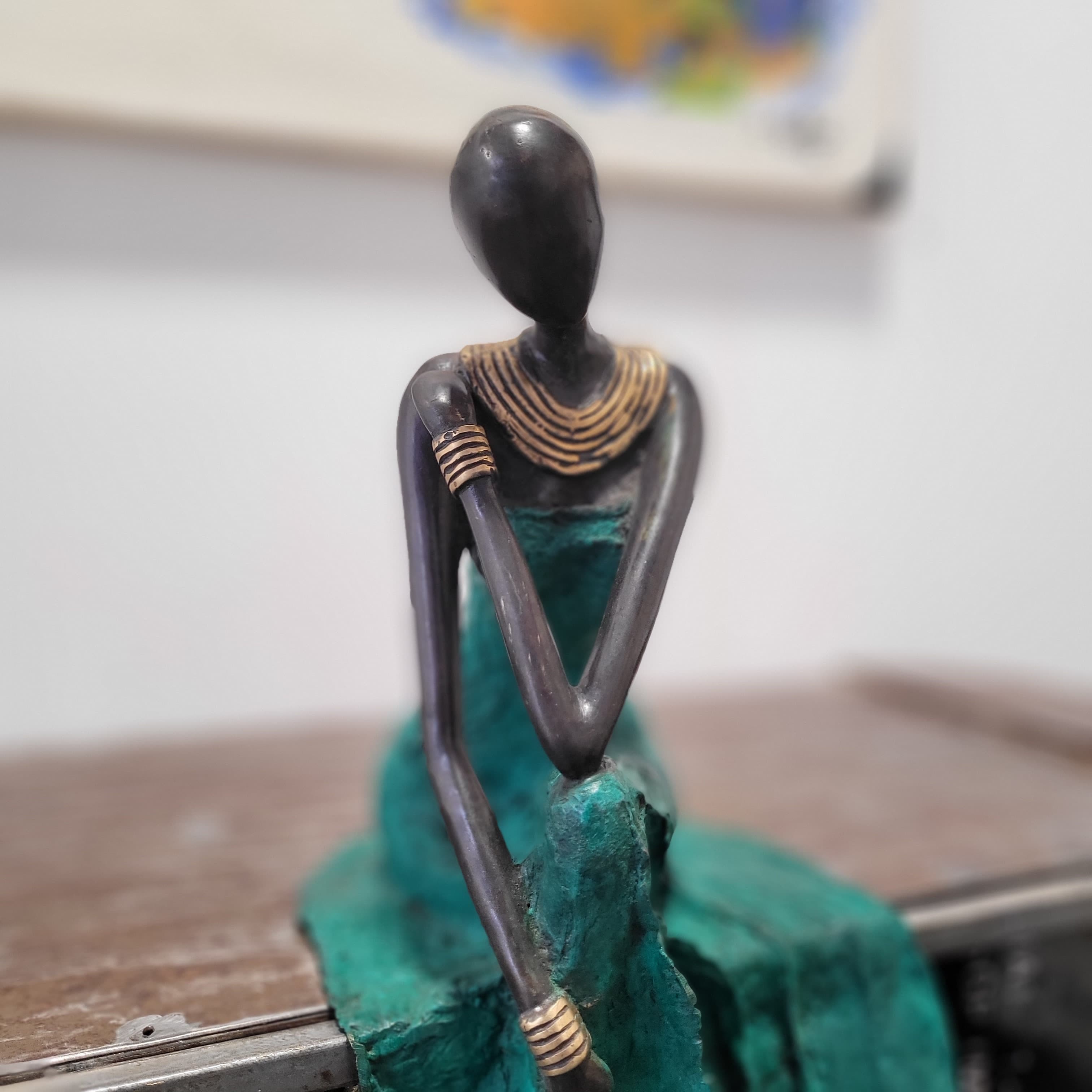 Diese wunderschöne Skulptur aus Bronze ist ein Einzelstück vom burkinischen Künstler Herman. Die Arbeit mit Bronze ist ein traditionelles Handwerk in Burkina Faso. Der Begriff Bronze bezieht sich auf verschiedene Legierungen auf der Basis von Kupfer, Zink, Blei und Zinn, deren Anteile variieren. Die Bronze stammt heute aus dem Recycling von alten Armaturen, wie Wasserhähnen oder Teilen aus Klimaanlagen. Der Künstler schafft zuerst eine Wachsskulptur, die mit einem Sandgemisch aus Lehm und Dung bedeckt und getrocknet wird. Die Form wird anschließend gekocht, das Wachs schmilzt und entweicht durch die Löcher. Die geschmolzene Legierung wird gegossen und nimmt den Platz des Wachses ein. Nach dem Abkühlen wird die Form gebrochen, um die Skulptur zu entnehmen und die letzten Feinschliffe vorzunehmen. Jedes Stück ist somit ein Unikat. Höhe: 56 cmGewicht: 6,5 kgRohstoff: Bronze, massivHandgemacht und fair gehandelt in Burkina Faso, Westafrika. WEITERE FOTOS AUF ANFRAGE !