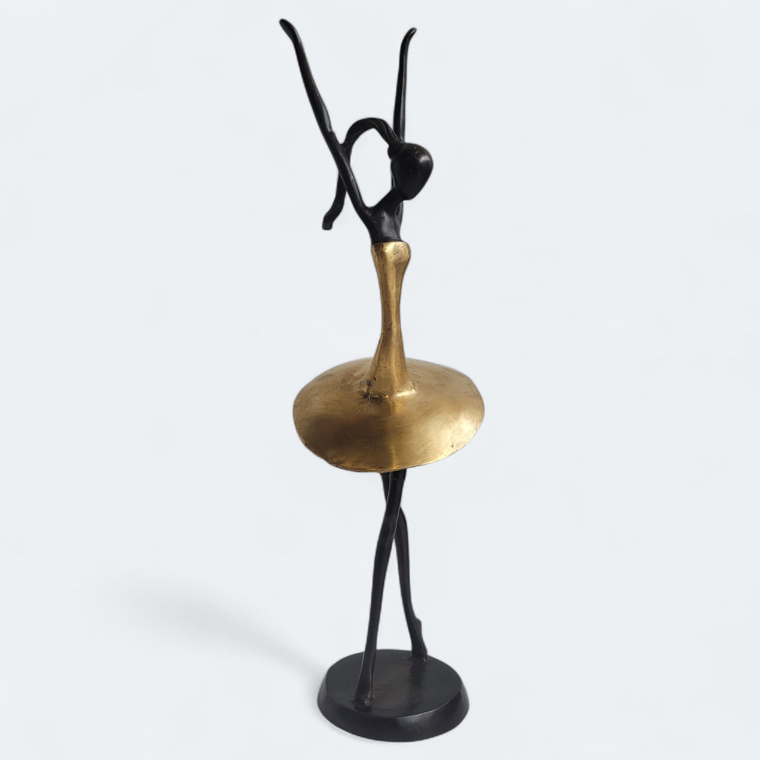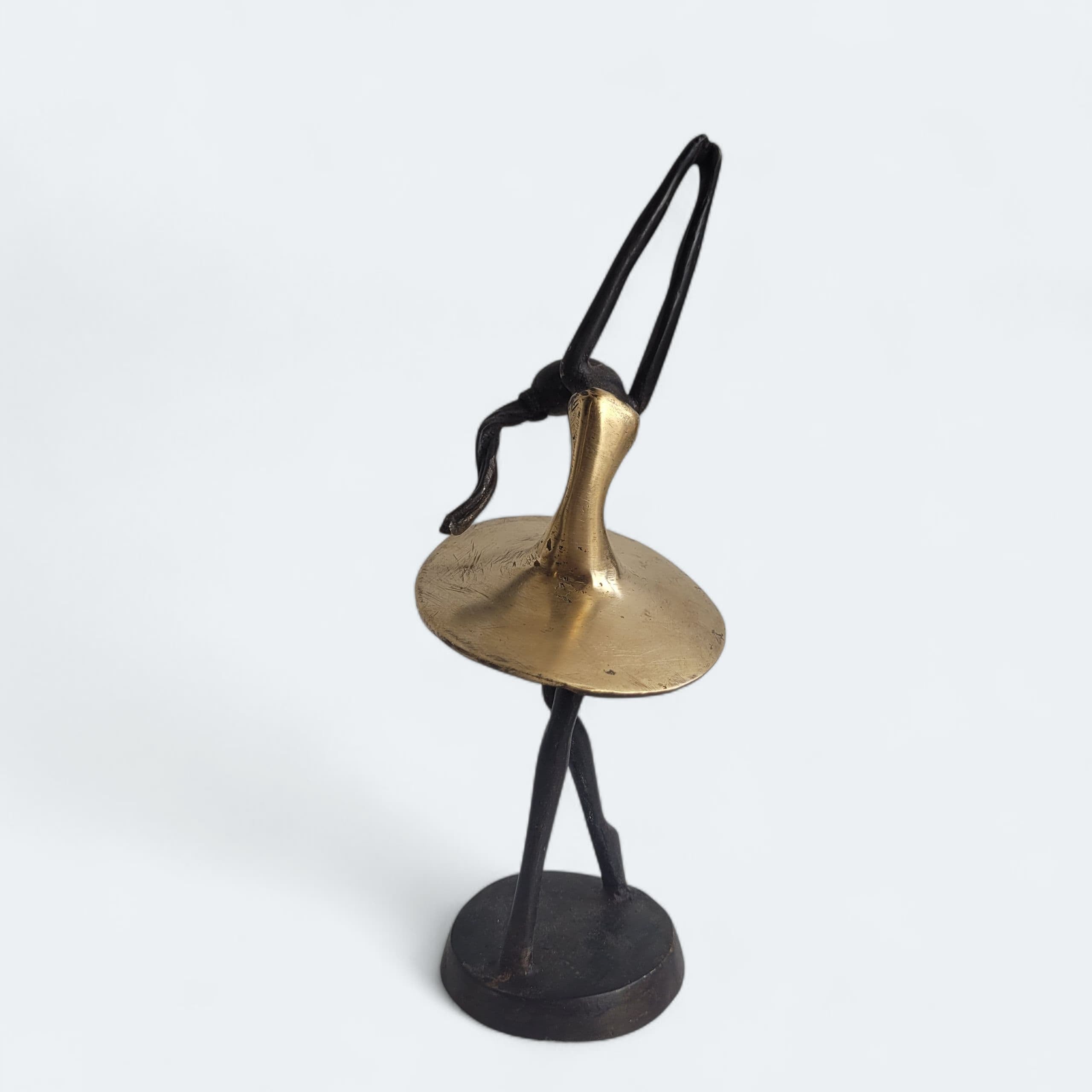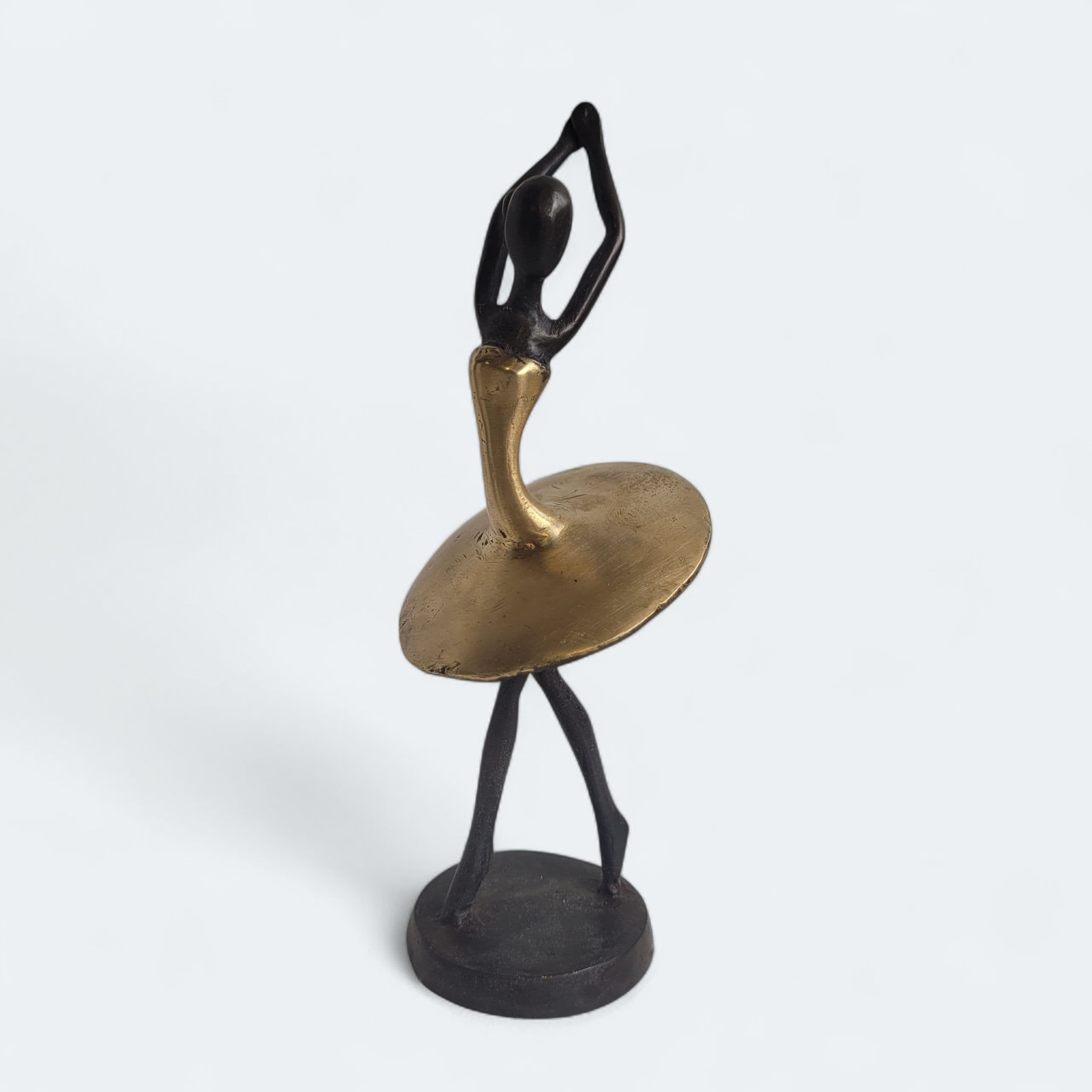 Diese eleganten Bronze-Skulpturen wurde vom burkinischen Künstler Karim Sana geschaffen. Es handelt sich hier um einzelne Unikate: Sie bekommen genau das Modell, das Sie auf dem Bild sehen und bestellen.Die Arbeit mit Bronze ist ein traditionelles Handwerk in Burkina Faso. Der Begriff Bronze bezieht sich auf verschiedene Legierungen auf der Basis von Kupfer, Zink, Blei und Zinn, deren Anteile variieren. Die Bronze stammt heute aus dem Recycling von alten Armaturen, wie Wasserhähnen oder Teilen aus Klimaanlagen.Der Künstler schafft zuerst eine Wachsskulptur, die mit einem Sandgemisch aus Lehm und Dung bedeckt und getrocknet wird. Die Form wird anschließend gekocht, das Wachs schmilzt und entweicht durch die Löcher. Die geschmolzene Legierung wird gegossen und nimmt den Platz des Wachses ein. Nach dem Abkühlen wird die Form gebrochen, um die Skulptur zu entnehmen und die letzten Feinschliffe vorzunehmen. Jedes Stück ist somit ein Unikat.Hergestellt und fair gehandelt in Burkina Faso, Afrika.Jedes Stück ist ein Unikat und kann leicht vom Bild abweichen. Höhe: ca. 20 cm / 27 cm / 40 cm Gewicht: ca. 0,37 kg / 0,6 / 1 kgFarbe: dunkle Patina (Schwarz/braun) und Gold (Originalfarbe von Bronze, unpatiniert)