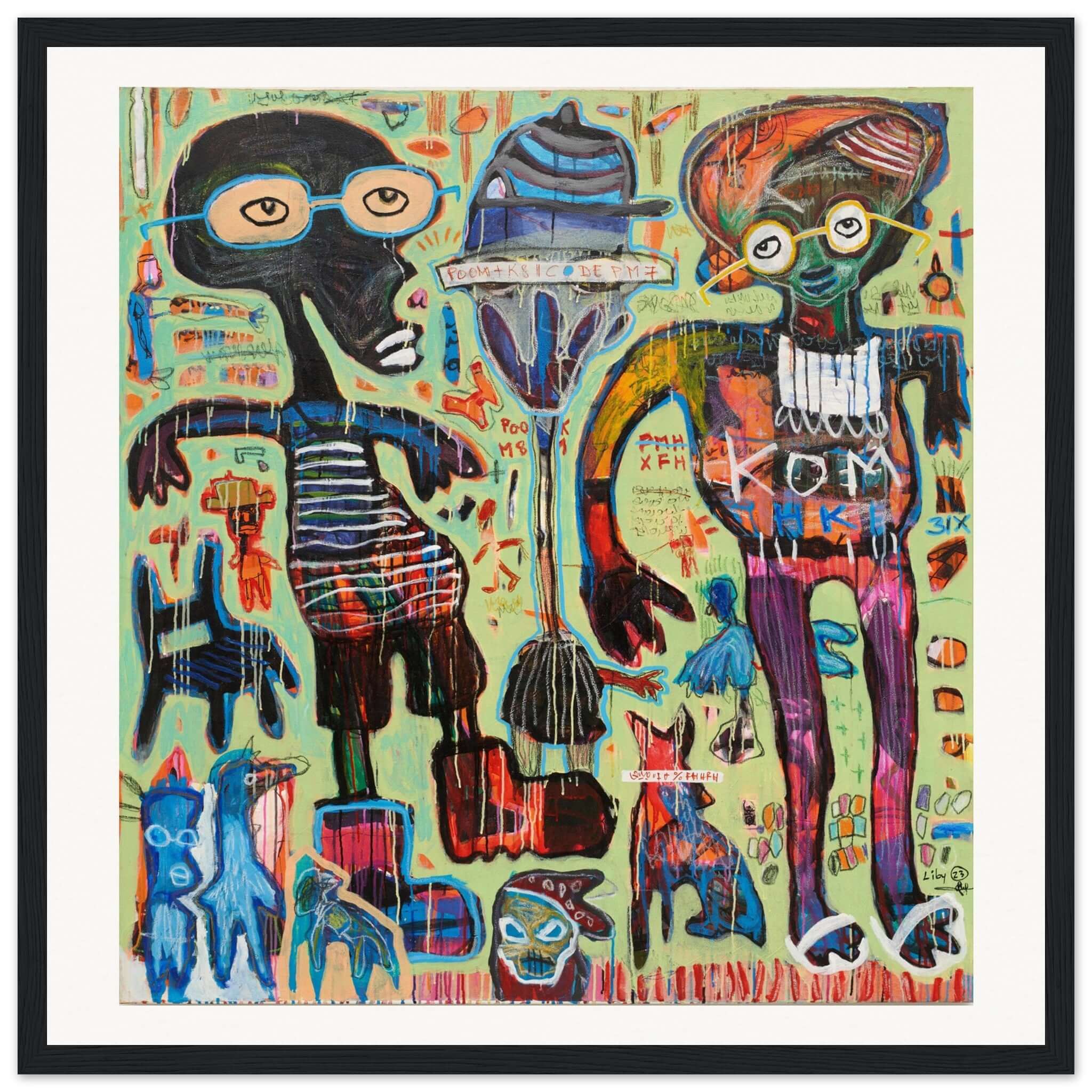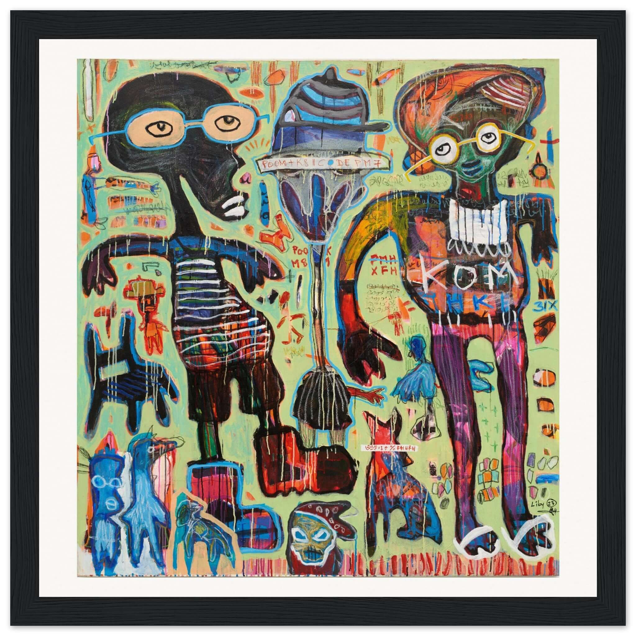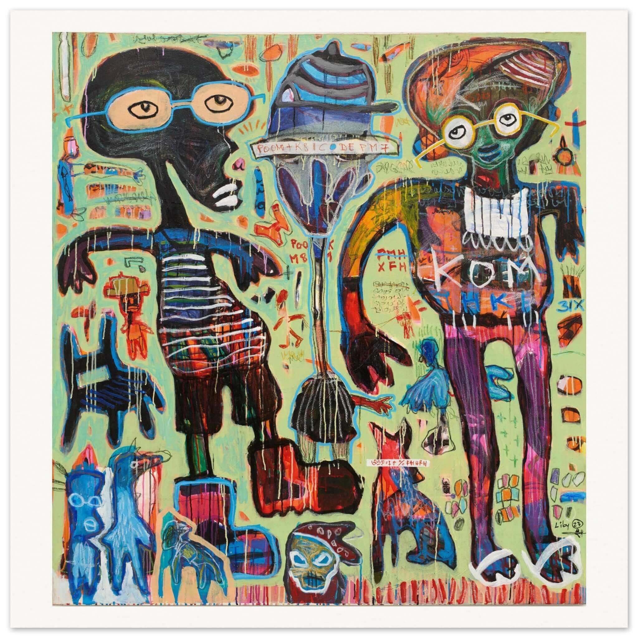 “Drôle d´histoire”, Liby Lougué, 2023 Liby Lougué wurde 1987 in Ouagadougou (Burkina Faso) als Sohn eines Kunstmalers und einer Schneiderin geboren. Er begann schon in jungen Jahren mit dem Zeichnen, indem er Comics und Porträts zeichnete, die er an seine Klassenkameraden verkaufte. Diese Leidenschaft für das Zeichnen entwickelte sich unter dem Eindruck und der Anleitung seines Vaters allmählich zu einer figurativen Malerei. Seine ersten Gemälde bestanden vor allem aus einer Fusion von Acrylfarbe und einer Collage aus heimischen Stoffen, die er im Atelier seiner Mutter gesammelt hatte. Im Jahr 2008 lernte er den burkinischen Maler und Designer Hamed Ouattara kennen, mit dem er seine Maltechniken verfeinerte. Seit 2011 nimmt er an zahlreichen Ausstellungen in Burkina Faso und Weltweit. Liby Lougué ist ein bekennender Bewunderer vom Jean-Michel Basquiats (1960 – 1988) Werk, das ihn auch sehr inspiriert. Wie bei Basquiat spiegeln auch die Werke von Liby Lougué seine Identität wider. Liby Lougué untersucht das Alltagsleben in Burkina Faso mit besonderer Aufmerksamkeit. Seine Arbeit enthält in den ersten Serien einen biografischen Gehalt. Der Künstler nutzt die Malerei mit dem Ziel, seine Beschwerden, seine Gefühle und seine Sicht auf die Welt und unsere Gesellschaft auszudrücken. Seine Werke offenbaren die sozialen Realitäten einer sich im Umbruch befindenden afrikanischen Gesellschaft. Wir bieten drei Formate an: – Unser schwereres, weißes, mattes Premium-Papier hat eine natürliche, glatte, ungestrichene Oberfläche, die sich luxuriös anfühlt. Das Papier mit einem Gewicht von 200 g/m2/ 80 lb ist haltbar und langlebig. – Unsere Master’s Edition, ein cremefarbenes Papier in Museumsqualität, ist ungestrichen und die beste Wahl für Kunstliebhaber, die erstklassige Qualität zu schätzen wissen, um Kunstwerke auf luxuriöse Weise zu genießen. Das 250 g/ 110lb-Papier eignet sich perfekt für Kunstwerke und ist so konzipiert, dass es jahrelang hält, ohne seine ursprüngliche Schönheit zu verlieren. Unser mattes Papier ist ungestrichen und naturweiß (off-white). – Unsere gerahmten Holzposter sind die perfekte Kombination aus Schlichtheit und Robustheit. Das Poster ist auf unserem Master’s Edition Papier in Museumsqualität gedruckt. Es ist cremefarben, ungestrichen und die beste Wahl für Kunstliebhaber, die erstklassige Qualität schätzen, um Kunstwerke auf luxuriöse Weise zu genießen. Wir verwenden FSC-zertifiziertes Papier oder gleichwertige Zertifizierungen, je nach regionaler Verfügbarkeit. Das ist besser für die Menschen und den Planeten. Jedes Poster wird in einer robusten Verpackung versandt, damit es sicher und geschützt ankommt.
