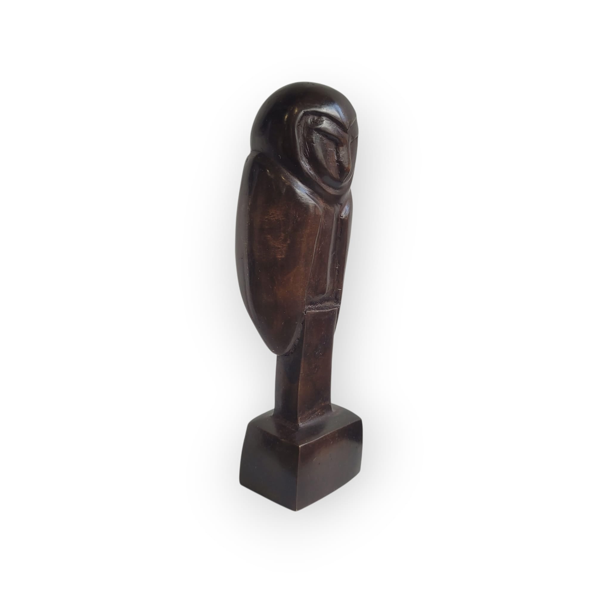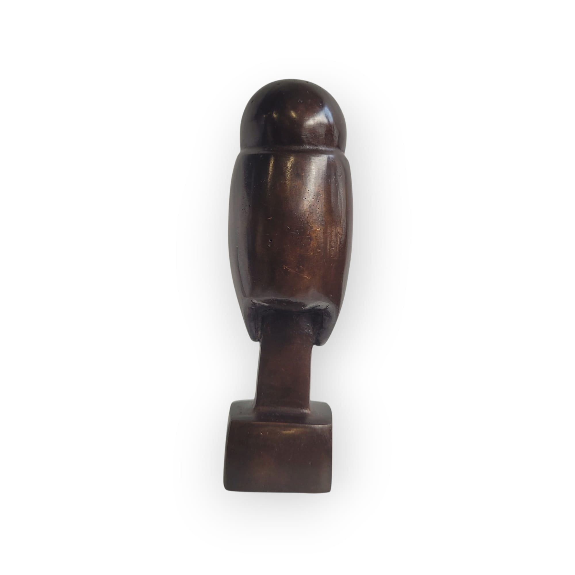 Diese kleine minimalistische Eule ist eine Kreation aus Bronze vom burkinischen Künstler Dermé (aus Ouagadougou). Diese elegante Bronze-Skulptur wurde vom burkinischen Künstler Derme geschaffen.Die Arbeit mit Bronze ist ein traditionelles Handwerk in Burkina Faso. Der Begriff Bronze bezieht sich auf verschiedene Legierungen auf der Basis von Kupfer, Zink, Blei und Zinn, deren Anteile variieren. Die Bronze stammt heute aus dem Recycling von alten Armaturen, wie Wasserhähnen oder Teilen aus Klimaanlagen.Der Künstler schafft zuerst eine Wachsskulptur, die mit einem Sandgemisch aus Lehm und Dung bedeckt und getrocknet wird. Die Form wird anschließend gekocht, das Wachs schmilzt und entweicht durch die Löcher. Die geschmolzene Legierung wird gegossen und nimmt den Platz des Wachses ein. Nach dem Abkühlen wird die Form gebrochen, um die Skulptur zu entnehmen und die letzten Feinschliffe vorzunehmen. Jedes Stück ist somit ein Unikat.Hergestellt und fair gehandelt in Burkina Faso, Afrika.Jedes Stück ist ein Unikat und kann leicht vom Bild abweichen. Höhe: 15 cmBreite: 5 cmTiefe: 4 cmGewicht: ca. 0,5 kg