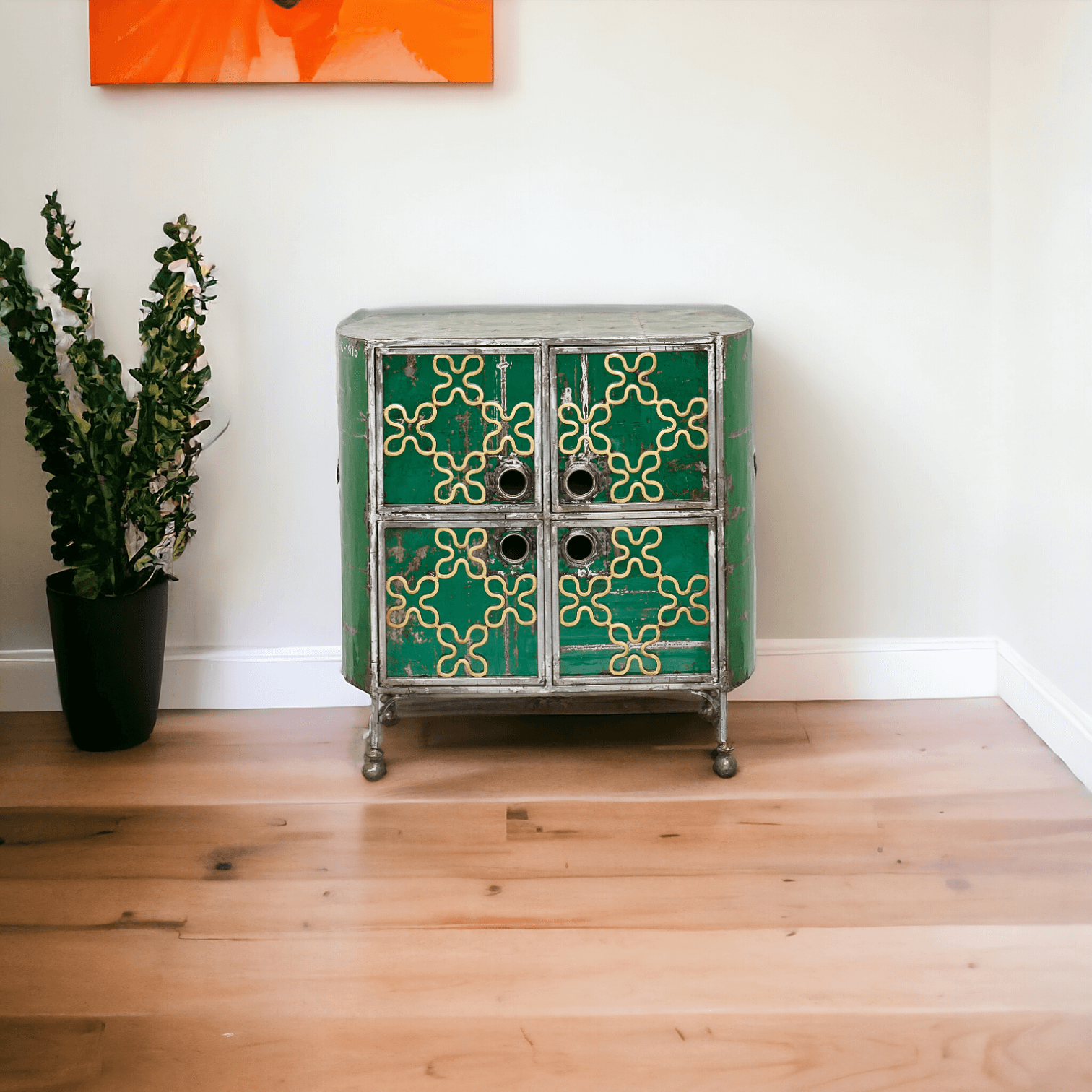 Als Maler und plastischer Künstler entwickelte Ouattara seinen Stil von vorerst figurativen Formen weg, hin zur Abstraktion. Dabei versuchte er sich erfolgreich an Leinwänden und kreierte auch erste Möbel. Seine Kunst manifestiert sich heute in der Kombination verschiedenster Materialien : traditionelle und industrielle Textilien, Ölfässer und industrielle Bleche sowie ausgefallener Stoffe, die Ouattara als “Zeitzeugen der modernen Welt und der damit zusammenhängenden Globalisierung” bezeichnet. Designer: Hamed OuattaraRohstoffe: Ölfässer und AltmetallMaße: H 100 x B 100 x T 40 cmGewicht: 40 kgHerkunftsland: Burkina Faso (Ouagadougou) Jedes Stück ist ein Unikat.