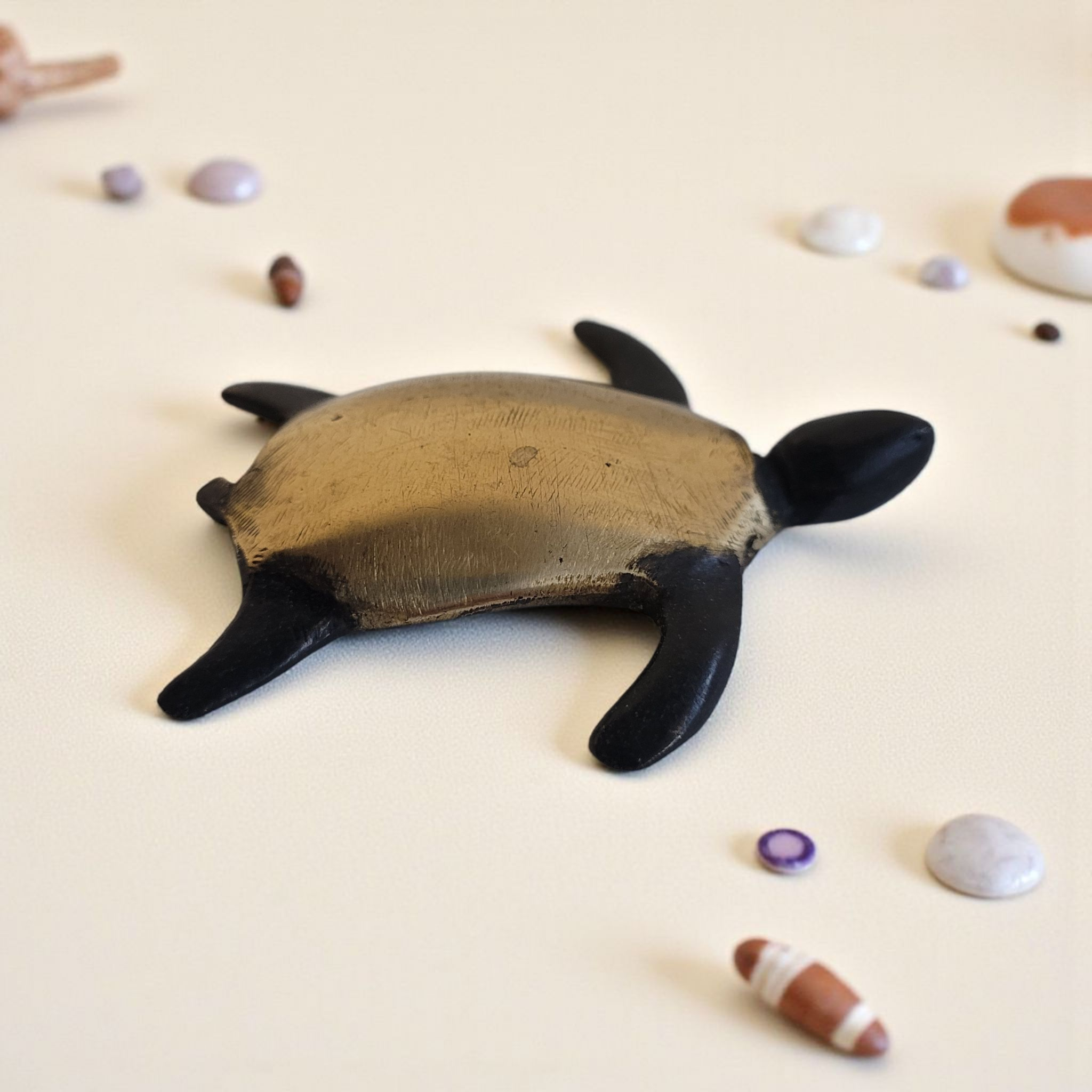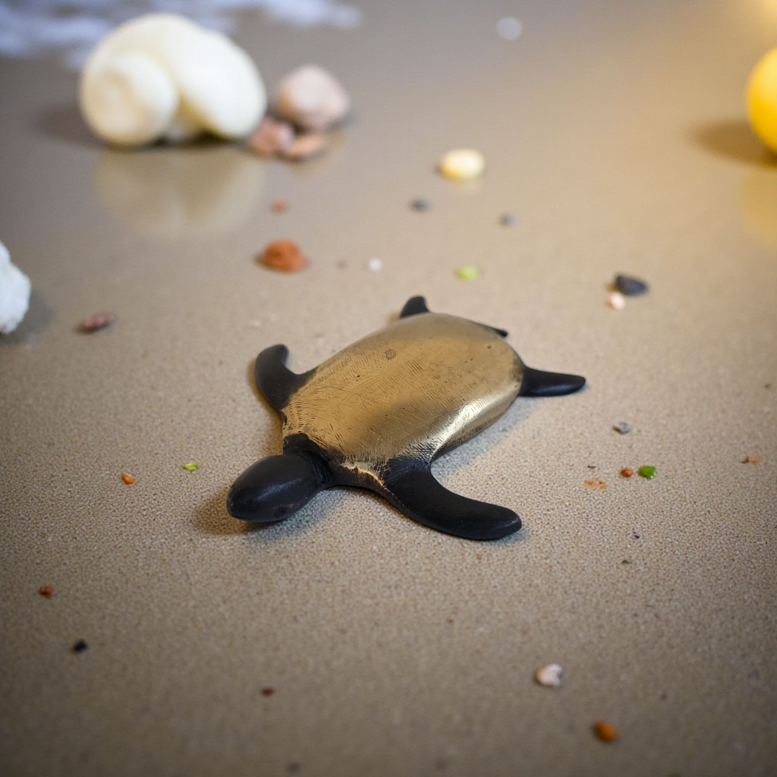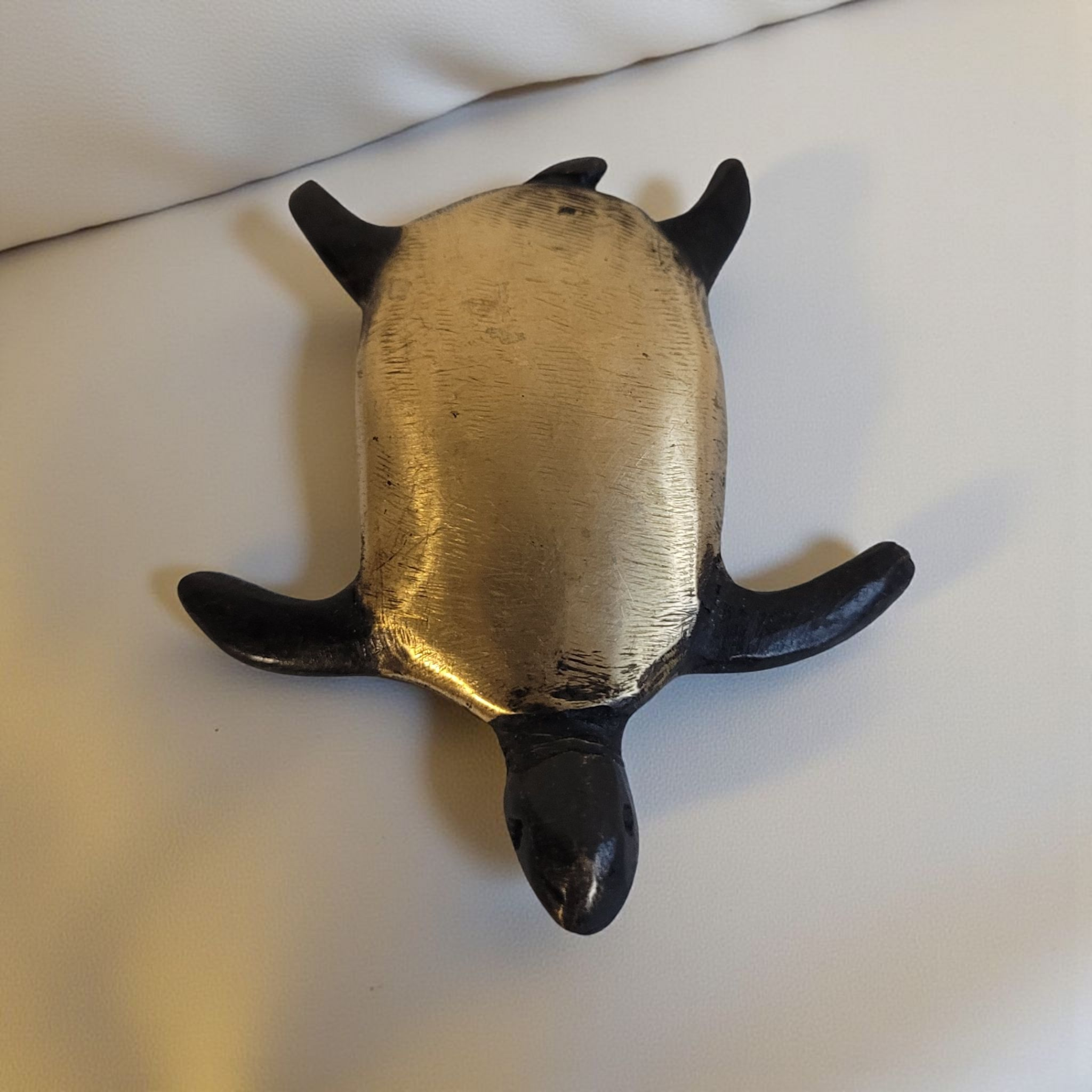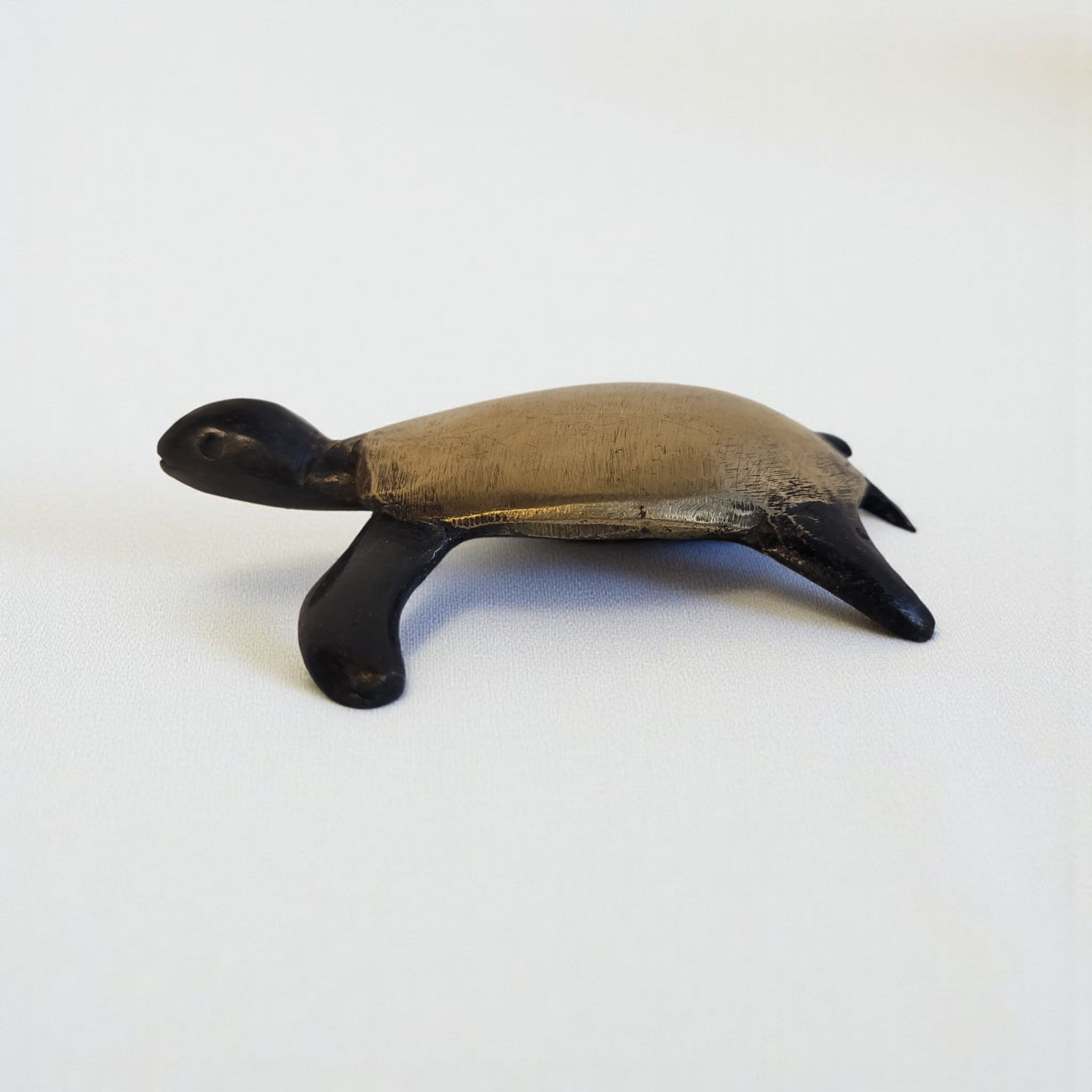 Minimalistische Meeresschildkröte aus Bronze, mit einer tollen Haptik. Diese Bronze-Skulptur wurde vom burkinischen Künstler Issouf Iboudou geschaffen.Die Arbeit mit Bronze ist ein traditionelles Handwerk in Burkina Faso. Der Begriff Bronze bezieht sich auf verschiedene Legierungen auf der Basis von Kupfer, Zink, Blei und Zinn, deren Anteile variieren. Die Bronze stammt heute aus dem Recycling von alten Armaturen, wie Wasserhähnen oder Teilen aus Klimaanlagen.Der Künstler schafft zuerst eine Wachsskulptur, die mit einem Sandgemisch aus Lehm und Dung bedeckt und getrocknet wird. Die Form wird anschließend gekocht, das Wachs schmilzt und entweicht durch die Löcher. Die geschmolzene Legierung wird gegossen und nimmt den Platz des Wachses ein. Nach dem Abkühlen wird die Form gebrochen, um die Skulptur zu entnehmen und die letzten Feinschliffe vorzunehmen. Jedes Stück ist somit ein Unikat.Hergestellt und fair gehandelt in Burkina Faso, Afrika.Jedes Stück ist ein Unikat und kann leicht vom Bild abweichen. Klein: Höhe: 1 cmLänge: 6,5 cmBreite: 5,5 cmGewicht: ca. 0,05 kg Mittel: Höhe: 1,5 cmLänge: 8 cmBreite: 8 cmGewicht: ca. 0,1 kg
