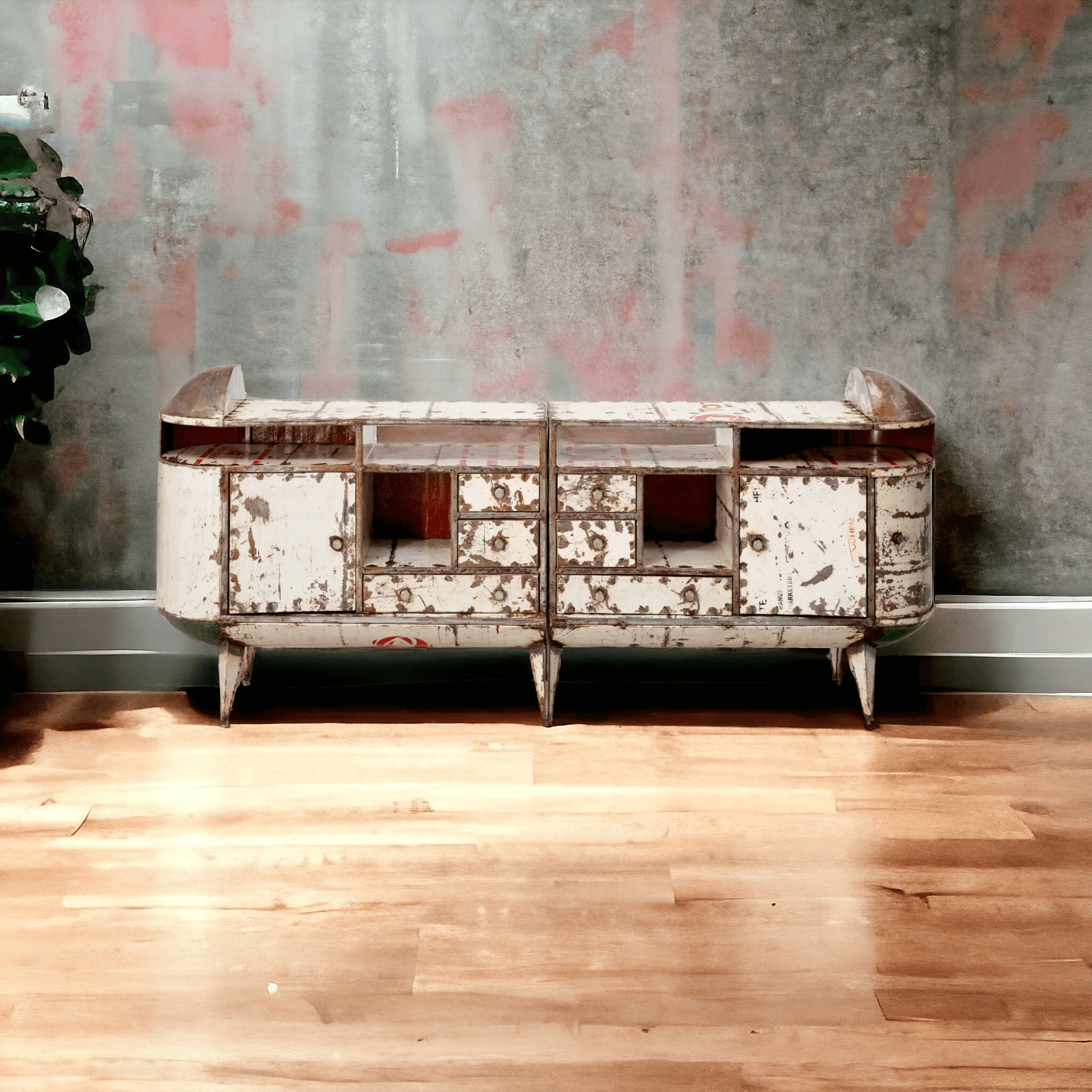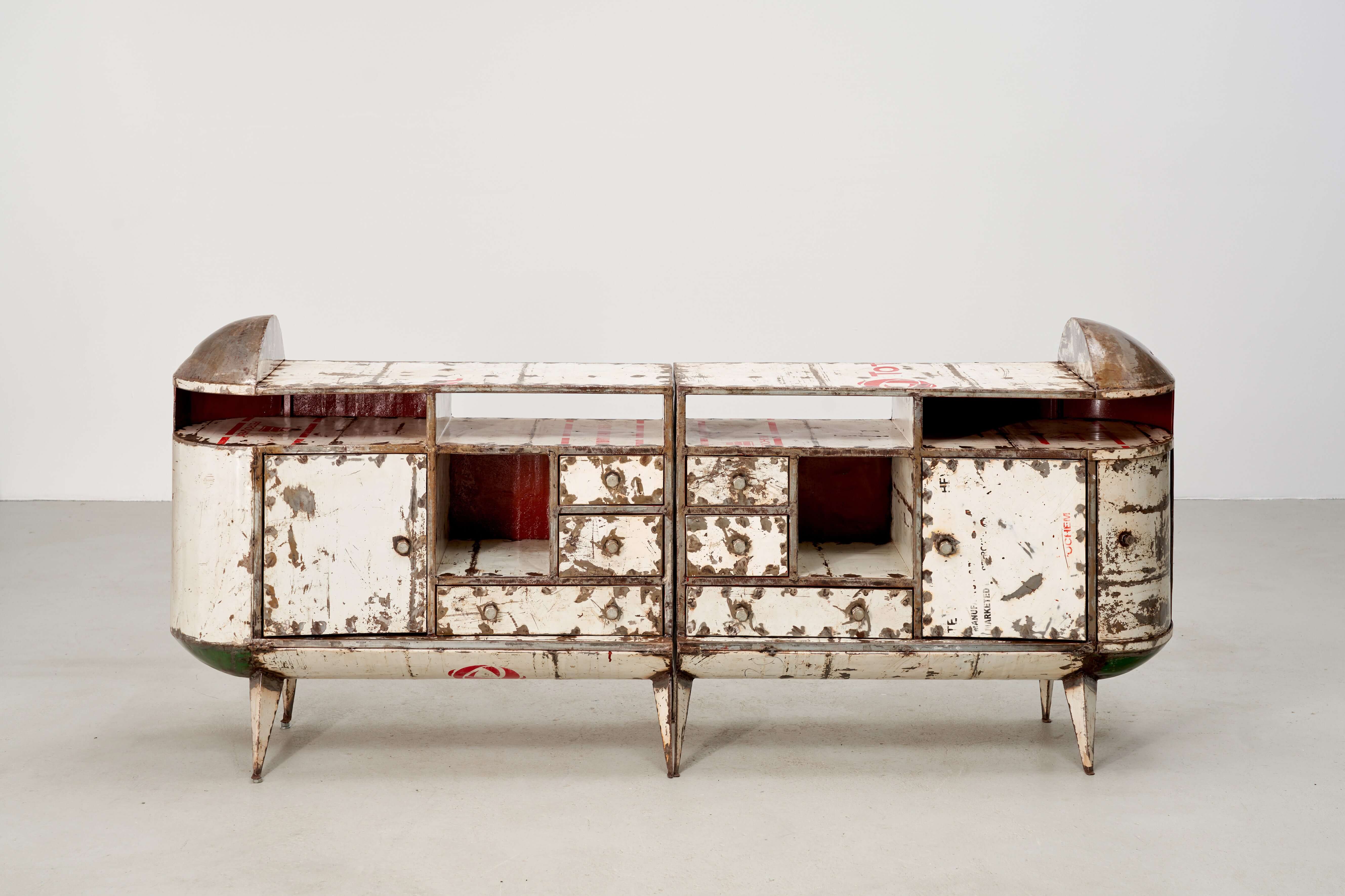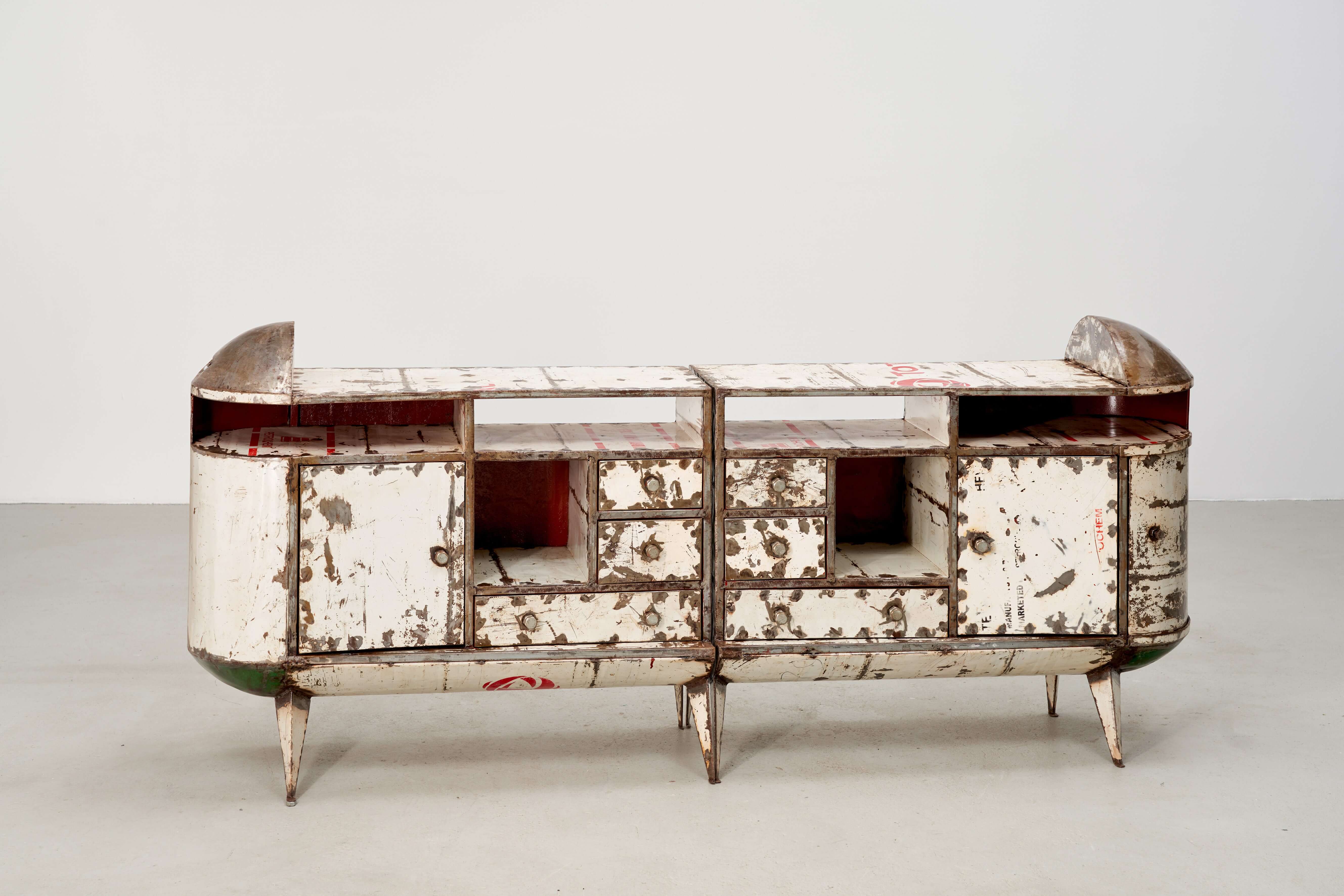 Als Maler und plastischer Künstler entwickelt Ouattara seinen Stil von vorerst figurativen Formen weg, hin zur Abstraktion. Dabei versucht er sich erfolgreich an Leinwänden und kreiert auch erste Möbel. Seine Kunst manifestiert sich heute in der Kombination verschiedenster Materialien : traditionelle und industrielle Textilien, Ölfässer und industrielle Bleche sowie ausgefallener Stoffe, die Ouattara als “Zeitzeugen der modernen Welt und der damit zusammenhängenden Globalisierung” bezeichnet. Rohstoffe: ÖlfässerMaße: H 80 x L 188 x B 40 cmGewicht: 60 kgHerkunftsland: Burkina Faso (Ouagadougou) Jedes Stück ist ein Unikat. In verschiedenen Farben erhältlich und in Wunschfarben herstellbar.