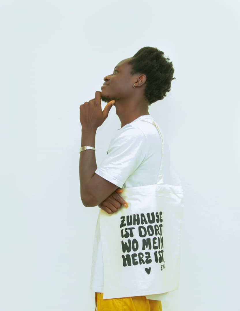 Höchster Qualität, bio- und Fairtrade-Stofftaschen, mit einer netten einfarbigen Siebdruck-Botschaft: „Zuhause ist dort, wo mein ❤️ist” – Ezé Über Ezé Wendtoin Ezé ist ein facettenreicher Schwarzer Künstler aus Burkina Faso, der seinen Migrationsvordergrund feiert. Geboren in Ouagadougou, ist Ezékiel Wendtoin Nikiema, alias Ezé, erst in Deutschland Schwarz geworden. Damit meint er nicht seine Hautfarbe, sondern die politische Dimension des Schwarzseins in Deutschland. Der mehrfach ausgezeichnete Künstler empowert sich mit seiner Musik selbst, in einer Gesellschaft, in der schwarze Afrikaner in viele Schubladen gesteckt werden, aus denen er kraftvoll ausbricht. Ezé ist Sänger, trilingualer Sprachschmied, Schlagzeuger, Gitarrist, Frontman on fire und neuerdings Rapper. Seine Texte schreibt und singt er auf Deutsch, Französisch und Mooré. Sein aktueller Sound ist von Afro-beats, Amapiano und westafrikanischen Rhythmen geprägt und ein klanglicher Spiegel seiner unterschiedlichen Erfahrungen. Wir haben Ezé durch seine Cover-Version von “Sage Nein” entdeckt und ihn in Februar 2021 in Ouagadougou persönlich kennengelernt. Wir waren verblüfft über die Energie, die er durch seine Kunst und sein Engagement transportiert. Bei uns könnt ihr seine Musik kaufen und ihn direkt unterstützen.