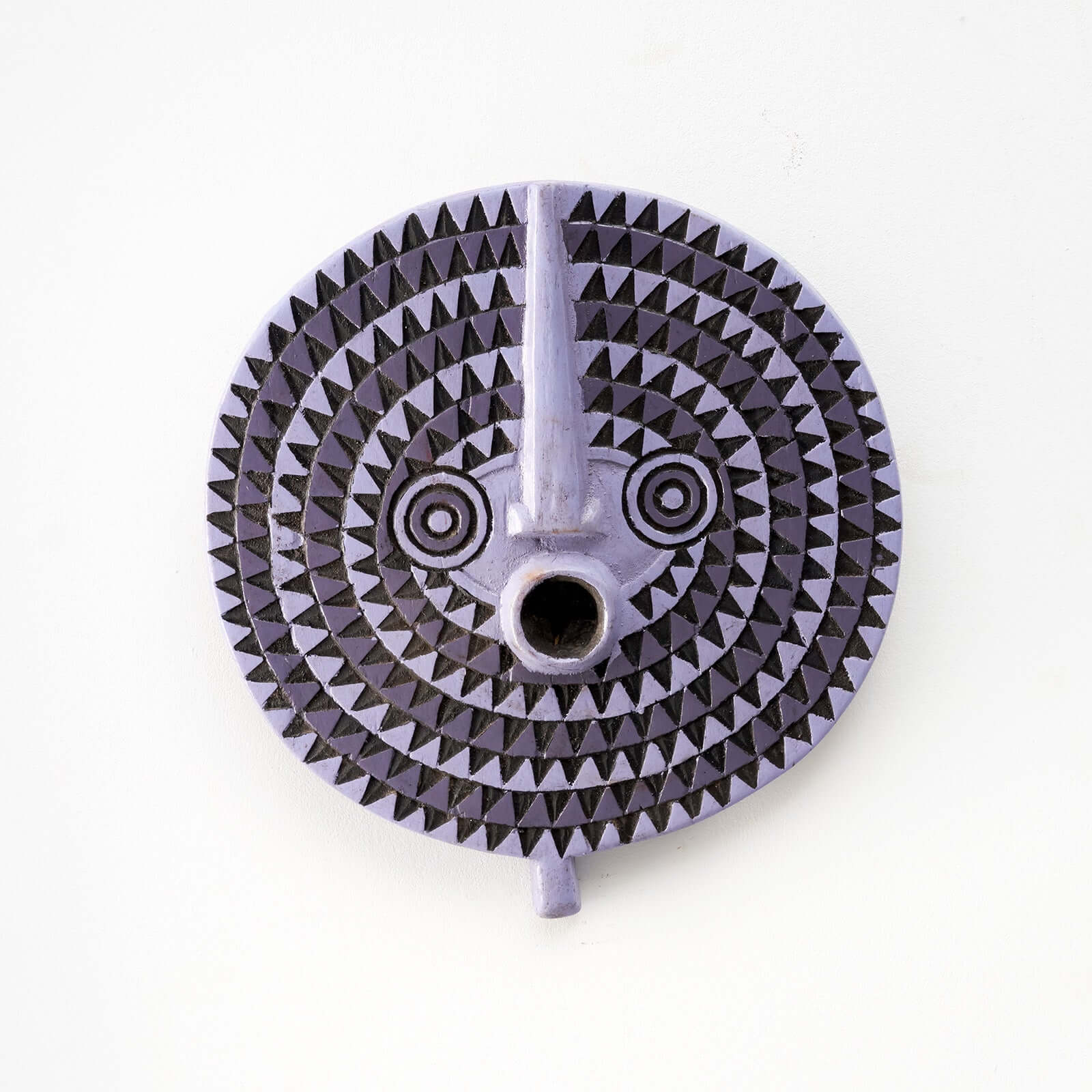 Diese Sonnenmaske aus Burkina Faso wird vor dem Gesicht getragen, gehalten von einem großen Seil, das der Tänzer zwischen den Zähnen hält, um die Ernte zu feiern und oder bekannte Persönlichkeiten bei deren Beerdigung zu ehren. Typisch für die afrikanische Kunst, stellt es die Sonne dar. Es ist mit Gravuren von zweifarbigen dreieckigen geometrischen Motiven verziert.Sie schützt das Dorf vor bösen Geistern, fördert die Heirat junger Menschen und bringt Neugeborenen Gesundheit. Seine Hauptfunktion ist es, das Böse auszulöschen und das gottgegebene Gleichgewicht zwischen Sonne, Erde und Regen wiederherzustellen.Designer: AncienRohstoffe: HolzDurchmesser: zw. 46-50 cmGewicht: ca. 2,3 kgJedes Stück ist ein Unikat.Eine Aufhängungsmöglichkeit ist auf der Rückseite vorhanden.Hergestellt und fair gehandelt in Burkina Faso.