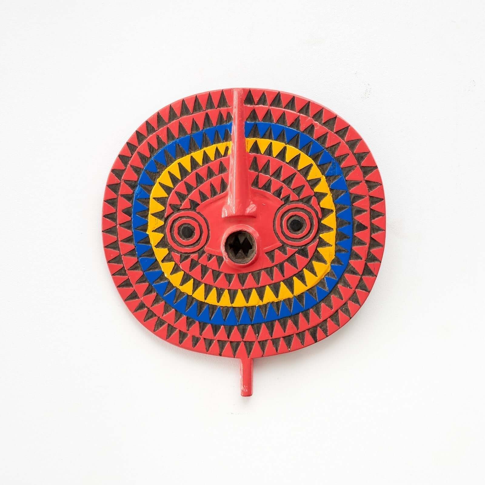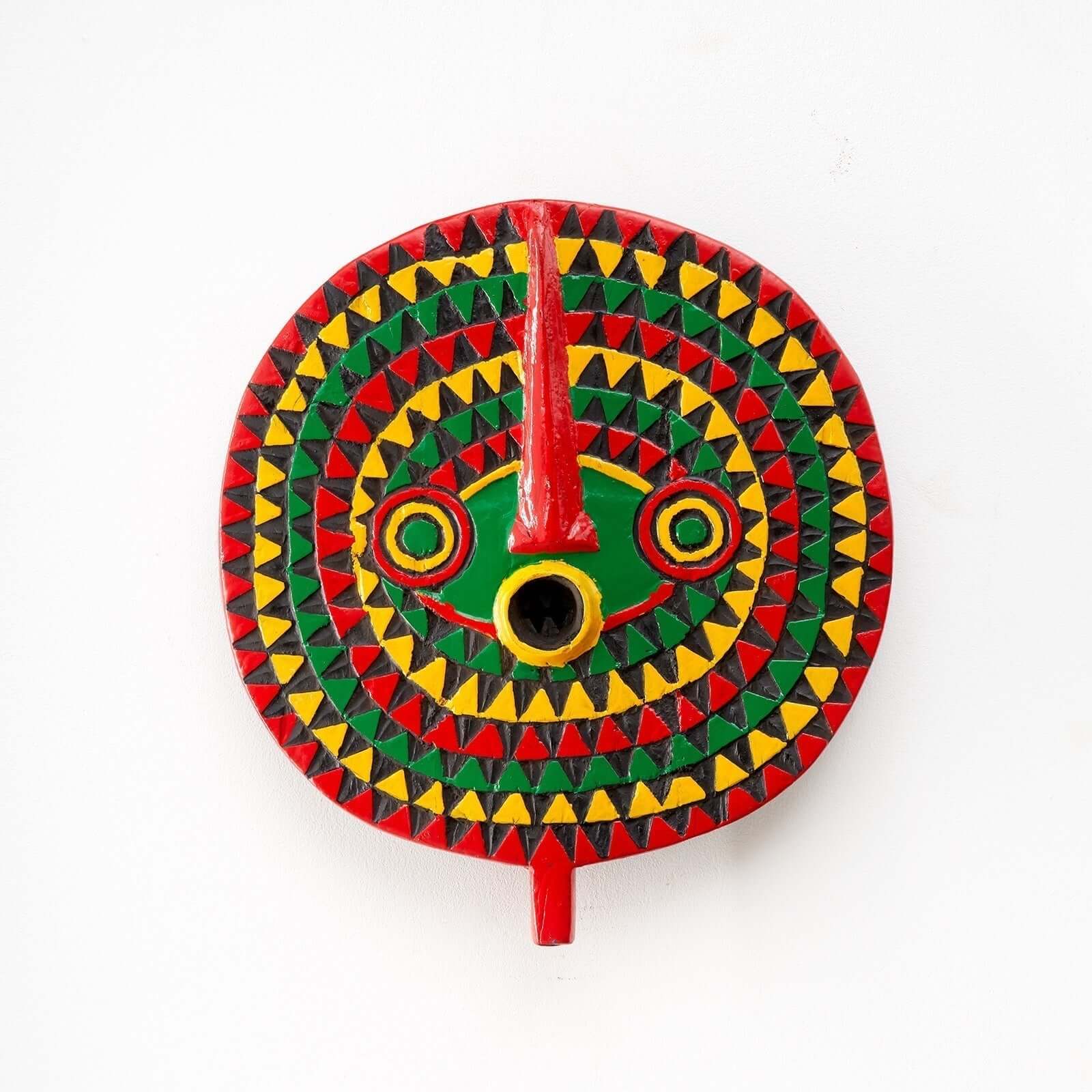 Diese Sonnenmaske aus Burkina Faso wird vor dem Gesicht getragen, gehalten von einem großen Seil, das der Tänzer zwischen den Zähnen hält, um die Ernte zu feiern und oder bekannte Persönlichkeiten bei deren Beerdigung zu ehren. Typisch für die afrikanische Kunst, stellt es die Sonne dar. Es ist mit Gravuren von zweifarbigen dreieckigen geometrischen Motiven verziert.Sie schützt das Dorf vor bösen Geistern, fördert die Heirat junger Menschen und bringt Neugeborenen Gesundheit. Seine Hauptfunktion ist es, das Böse auszulöschen und das gottgegebene Gleichgewicht zwischen Sonne, Erde und Regen wiederherzustellen.Designer: AncienRohstoffe: HolzDurchmesser: ab 59 cmGewicht: ca. 3,5 kgJedes Stück ist ein Unikat.Eine Aufhängungsmöglichkeit ist auf der Rückseite vorhanden.Hergestellt und fair gehandelt in Burkina Faso.